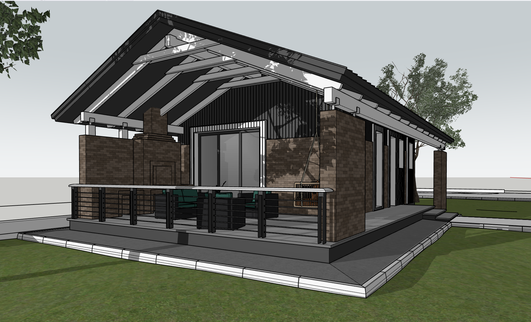 sky type procedural atmospheric sky hdri clouds clouds cumulus cirrus volumetric soft edges coverage 40 sky brightness 0 85 saturation 0 9 lighting sun angle 38 azimuth 140 shadow softness 0 6 blur sun intensity 1 2 ambient light 0 3 lawn type procedural grass 3d in the foreground area from camera to terrace depth 5 meters grass height 4 cm variability 1 cm color base 5a8f4c variations 6ba35e 4a7a3e edging steel garden border black along the terrace edge additional atmospheric haze enabled distance 50 meters depth of field off everything in focus to show the surroundings lens flares minimal only from the sun