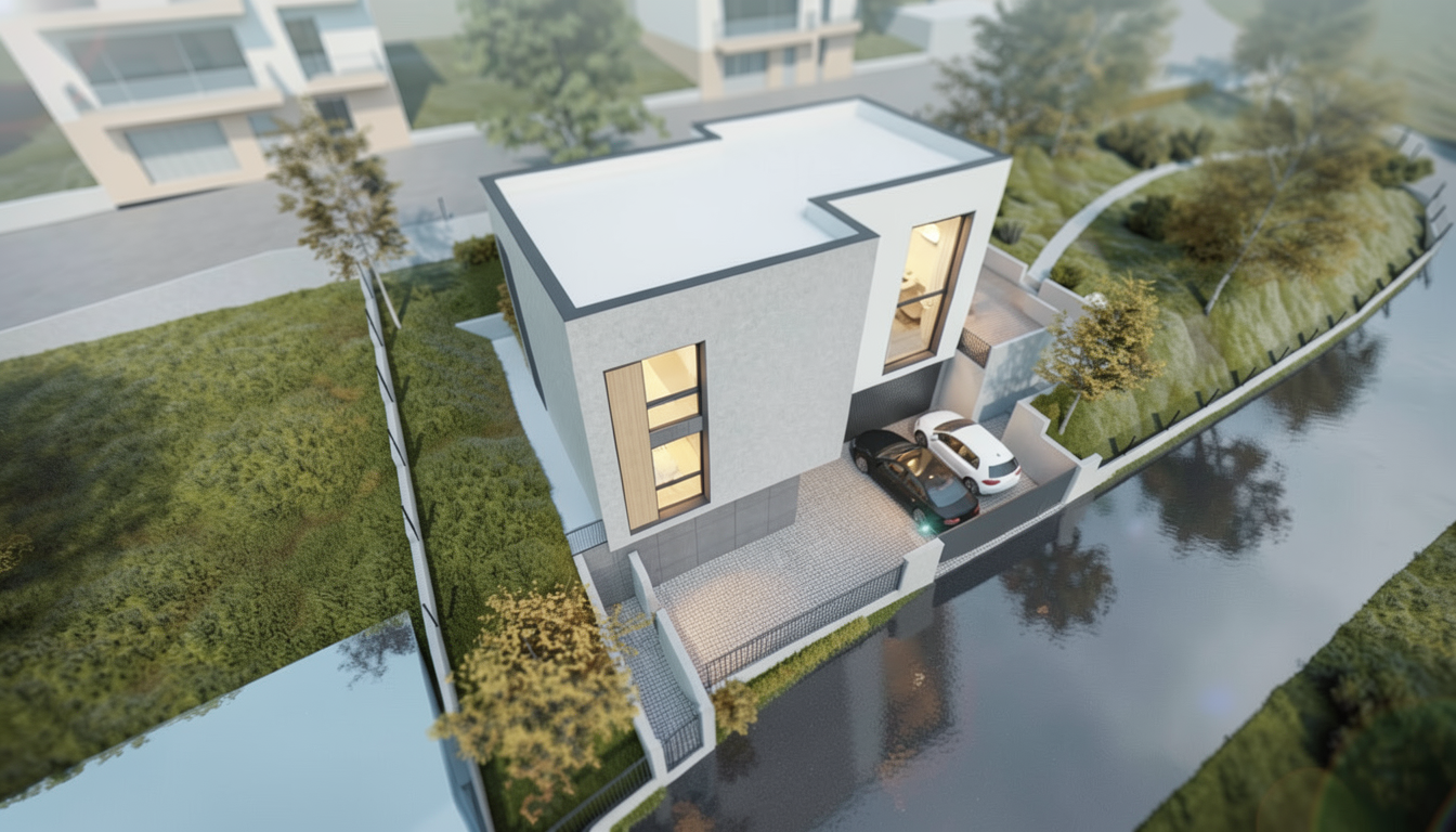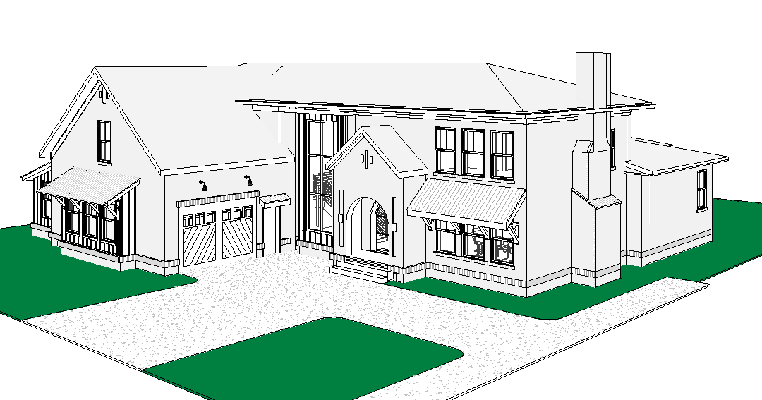 blue skies daytime paver driveway landscaping and grass black shingle roof white fascia around roof edge small black metal roofs over those windows white brick windows to have black frame