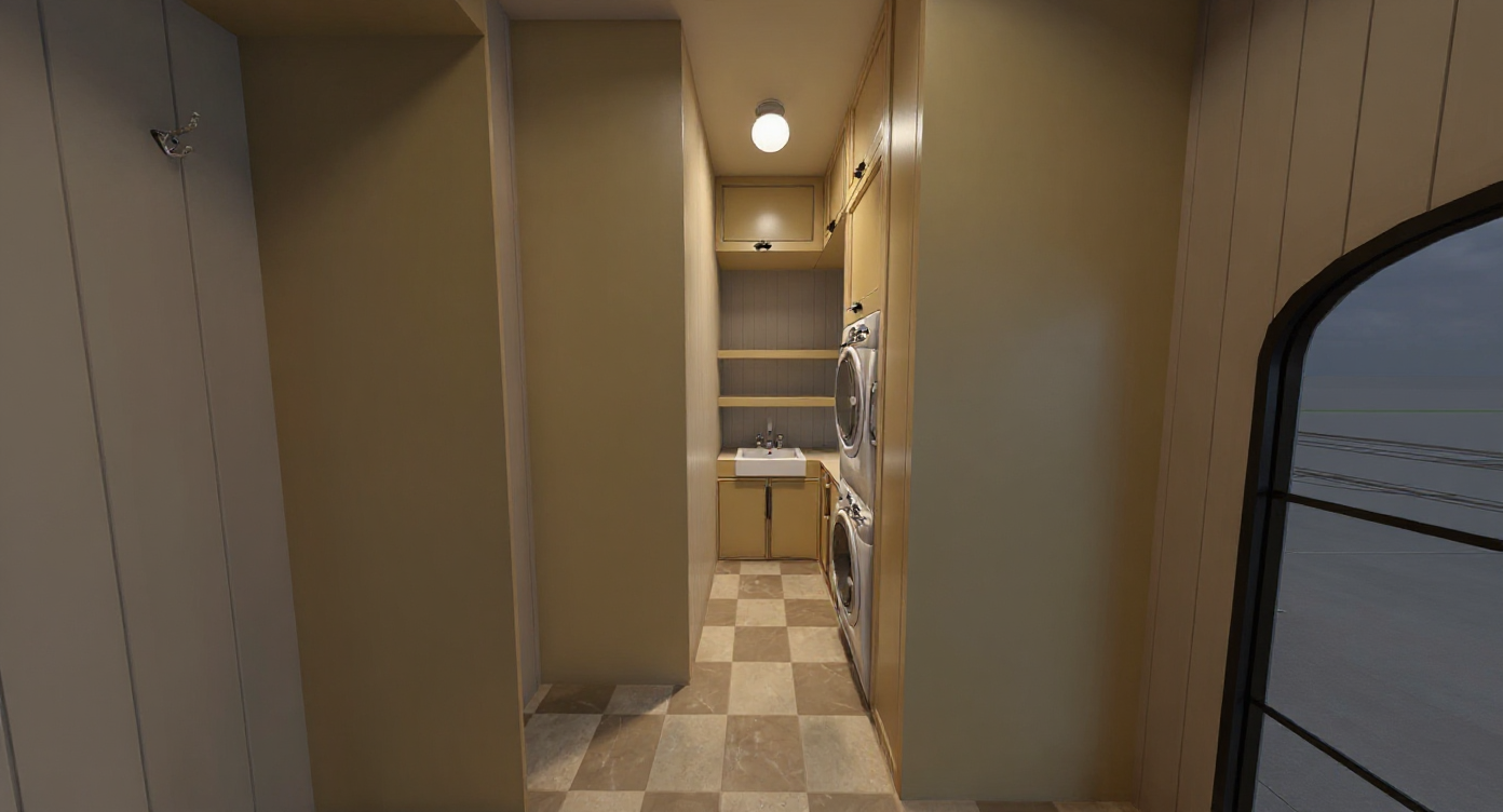 modernist exterior shot ultra realistic architectural render frontal view only modern high standard house facade strictly following the floor plan proportions materials and colors light beige smooth stucco walls medium gray contrast details thin vertical dark stone cladding pedra ferro one single large modern closed black gate chapa lisa aligned with the garage entrance plus small pedestrian gate in the wall closed front wall connecting both sides with elegant design balcony with seamless clear glass railing no visible frames windows and doors with minimal modern chrome finishing street view context house facing the road with realistic sidewalk curb and asphalt street in front minimal high end landscaping small ornamental plants and vivid green grass inside the wall high resolution ultra realistic high end residential architecture photography style architecture