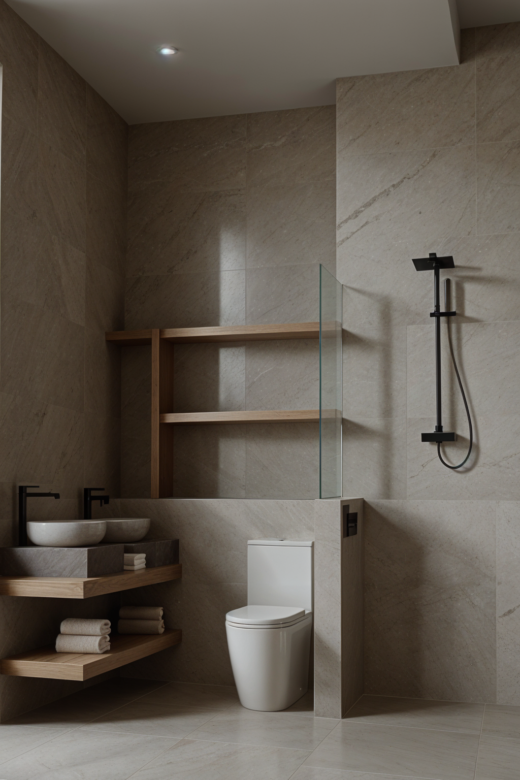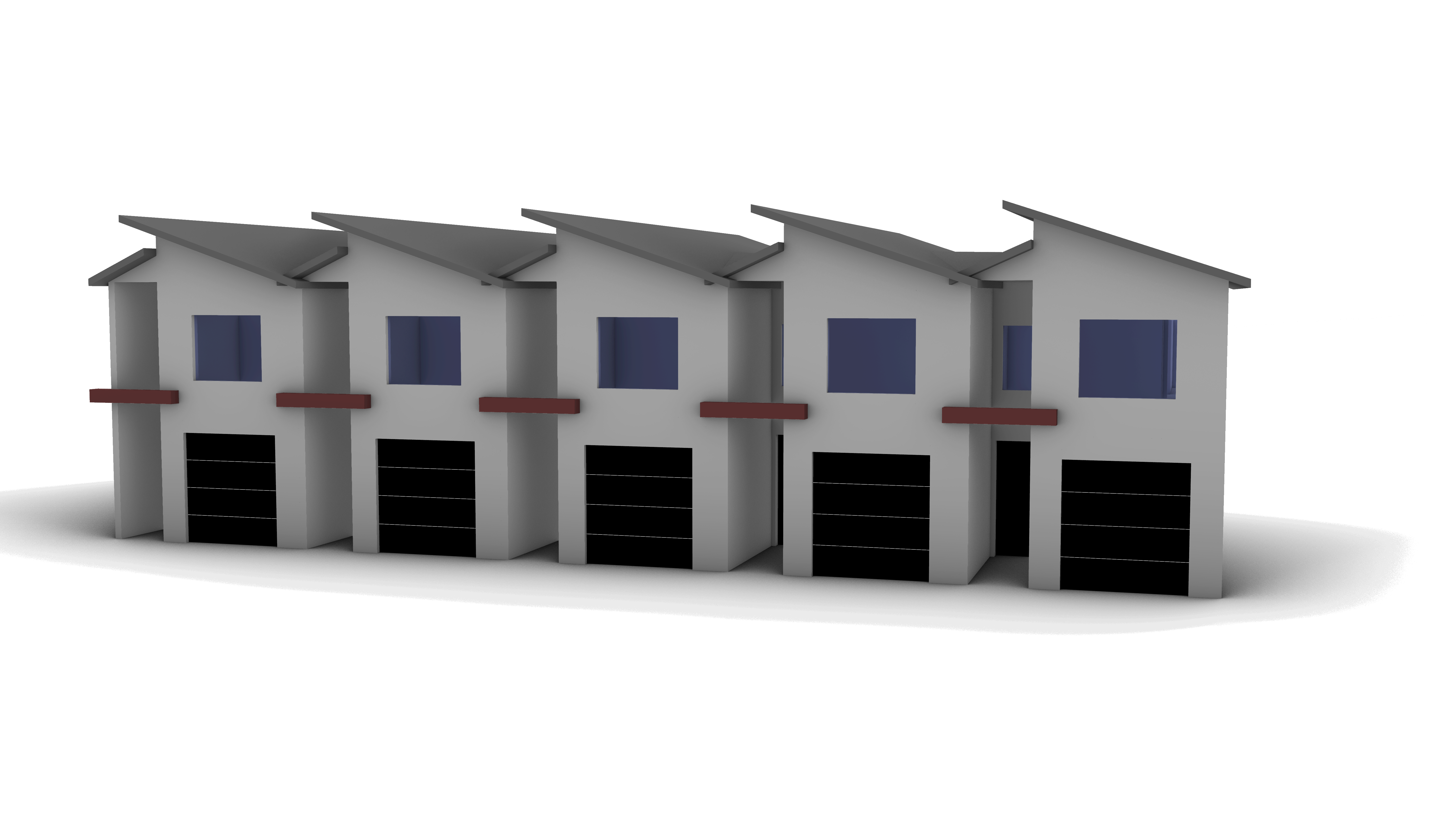 render this townhome building in a west coast modern style keeping all existing geometry and proportions exactly as shown use a rich yet balanced material palette featuring dark metal panels smooth fiber cement or stucco in warm grey tones and moderate accents of natural wood such as vertical cedar cladding or soffit details to introduce warmth each vertical roof segment should read as a distinct unit by subtly varying the material combinations alternate between darker metal lighter grey panels and wood tones for contrast and rhythm the large doors on the lower level are garage doors and should appear as modern dark aluminum or composite panel styles not wood include black framed windows clean detailing and restrained trim lighting should be soft and natural to highlight textures and shadow lines the surrounding landscape should be minimalist and modern with low plantings and concrete or paver walkways consistent with west coast modern design