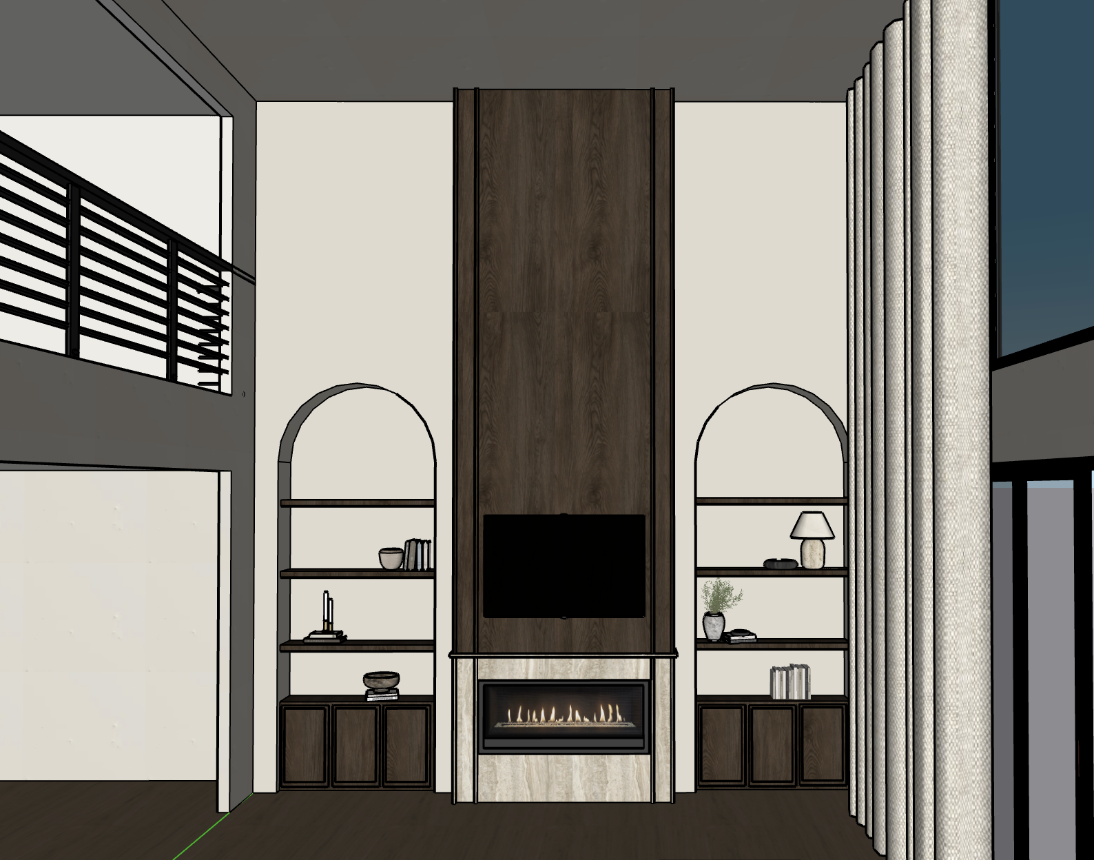 this is a rendering from sketchup i d just like it to feel slightly more realistic in lighting and material depth please don t change any of the design elements or content i still want it to clearly read as a rendering just with a bit more realism and refinement make the walls sherwin williams accessible beige the cabinetry and wood part of the fireplace being a dark warm oak that is shown in the image make the bottom of the fireplace a beige limestone wash