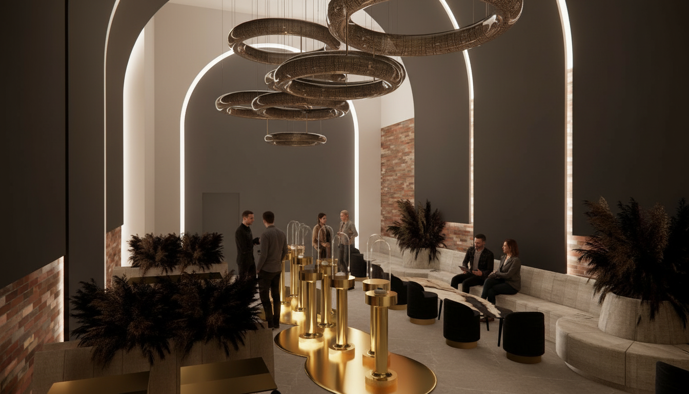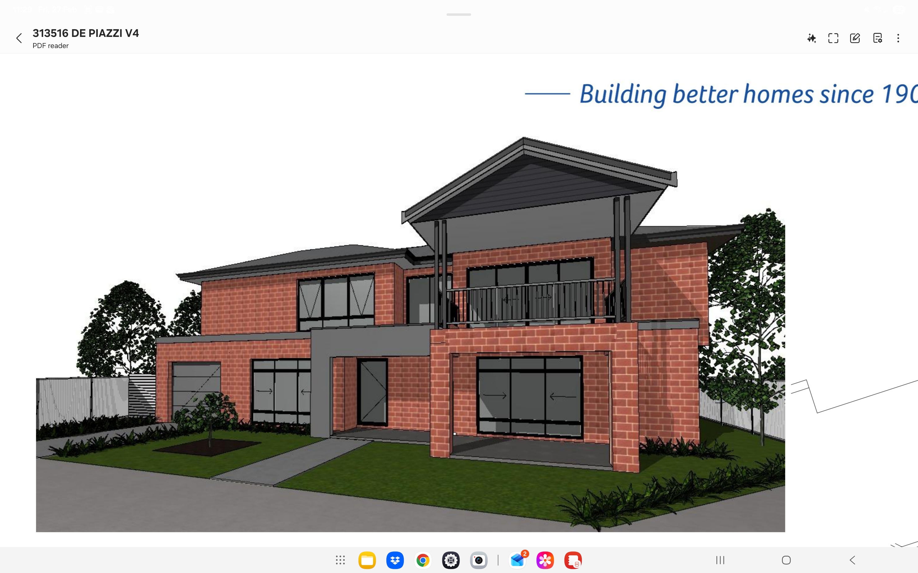exterior shot modern two story house brick fa ade in warm terracotta hues sleek charcoal gray roof and window frames surrounding greenery with vibrant deep green lawn and bushes subtle shadows create a serene sunny atmosphere with clear blue skies soft sunlight highlighting architectural details emphasize clean lines and a contemporary aesthetic inviting and elegant