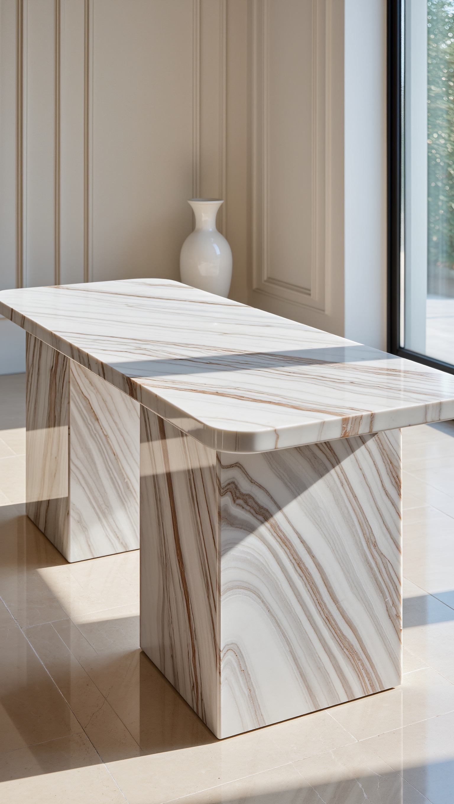 make the color of the table a luxurious marble table with subtle veining photographed in a bright elegant interior the main color palette is pantone 11 4201 cloud dancer soft airy white creating a clean and sophisticated atmosphere minimalist background with soft natural lighting slight shadows on the table surface high resolution photorealistic style focus on the table s texture and color