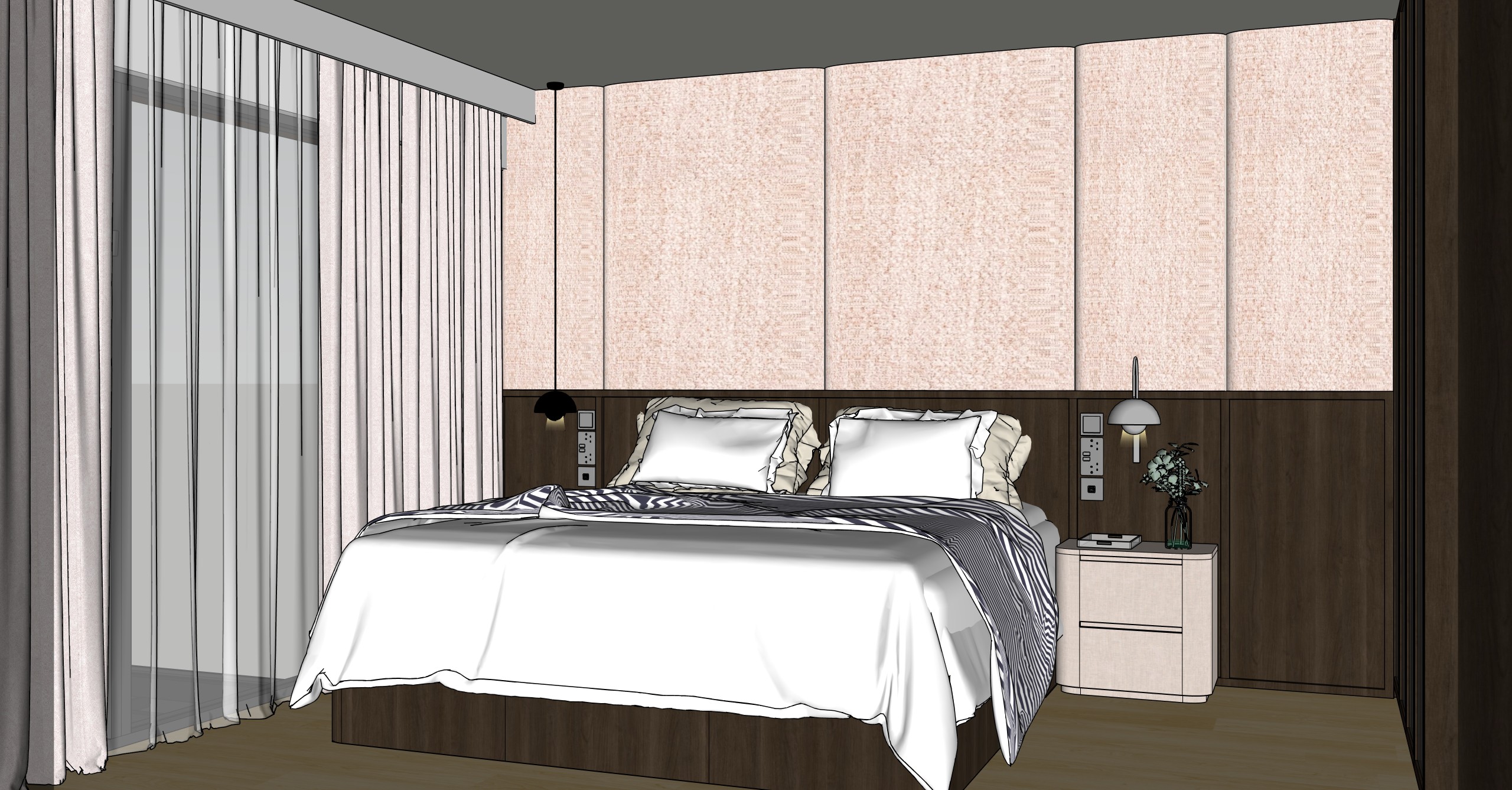 make the wood colours and texture less grains accurate the wall is cushion with the fabric being pinkish