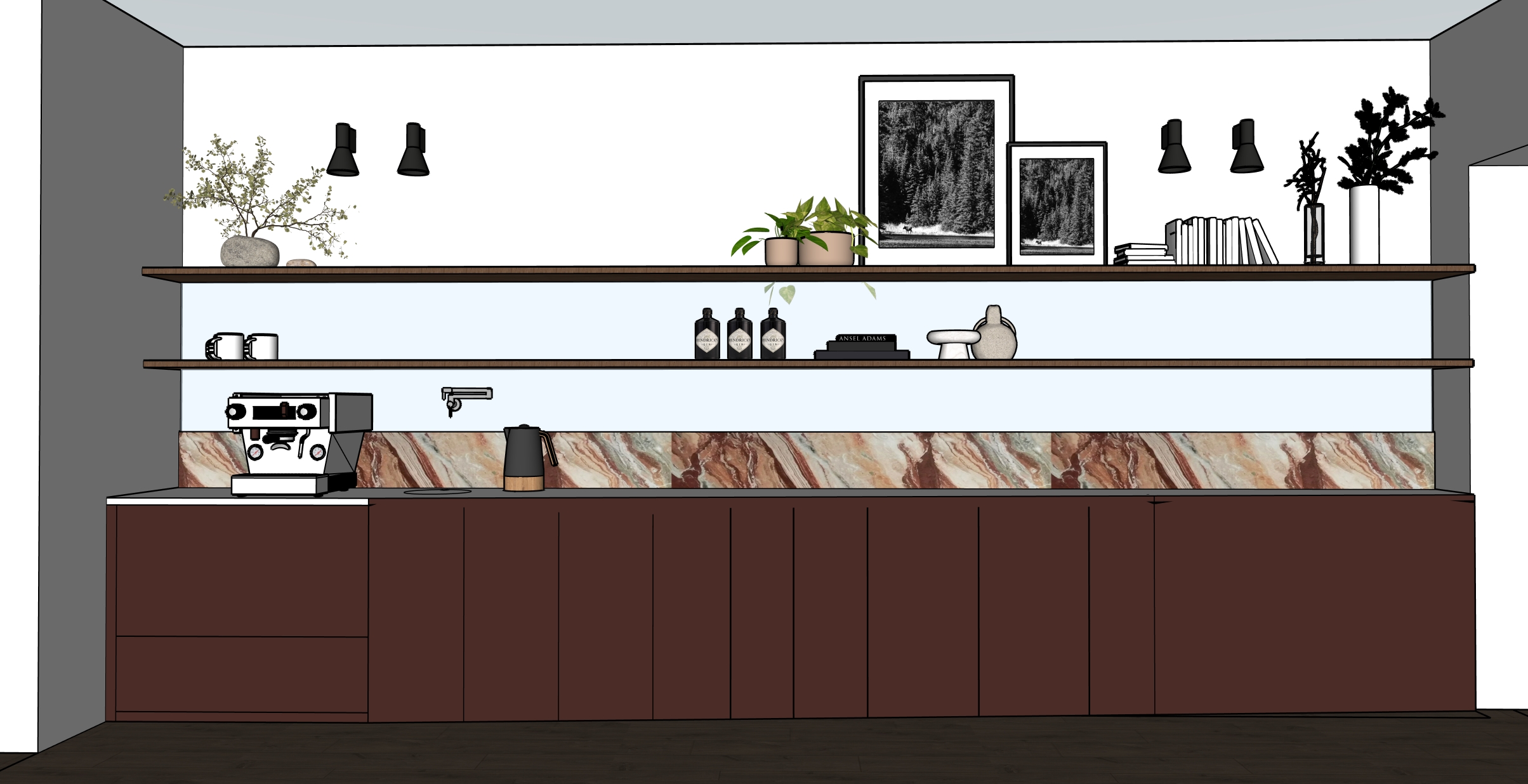 the backsplash above the marble and between the floating shelves is mirror the lower cabinets are a dark red colour that matches the red tone in the marble