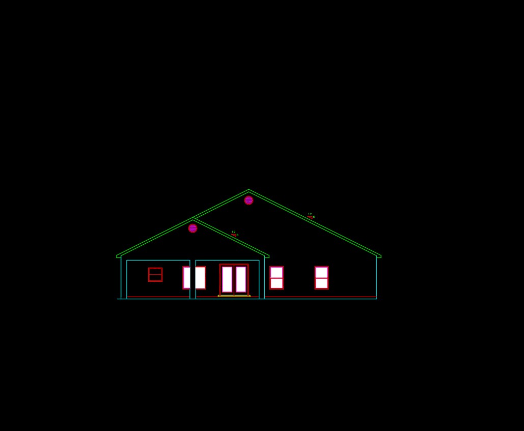 render exaclty elevation render with light inside with white stucco on front walls blck trim roof
