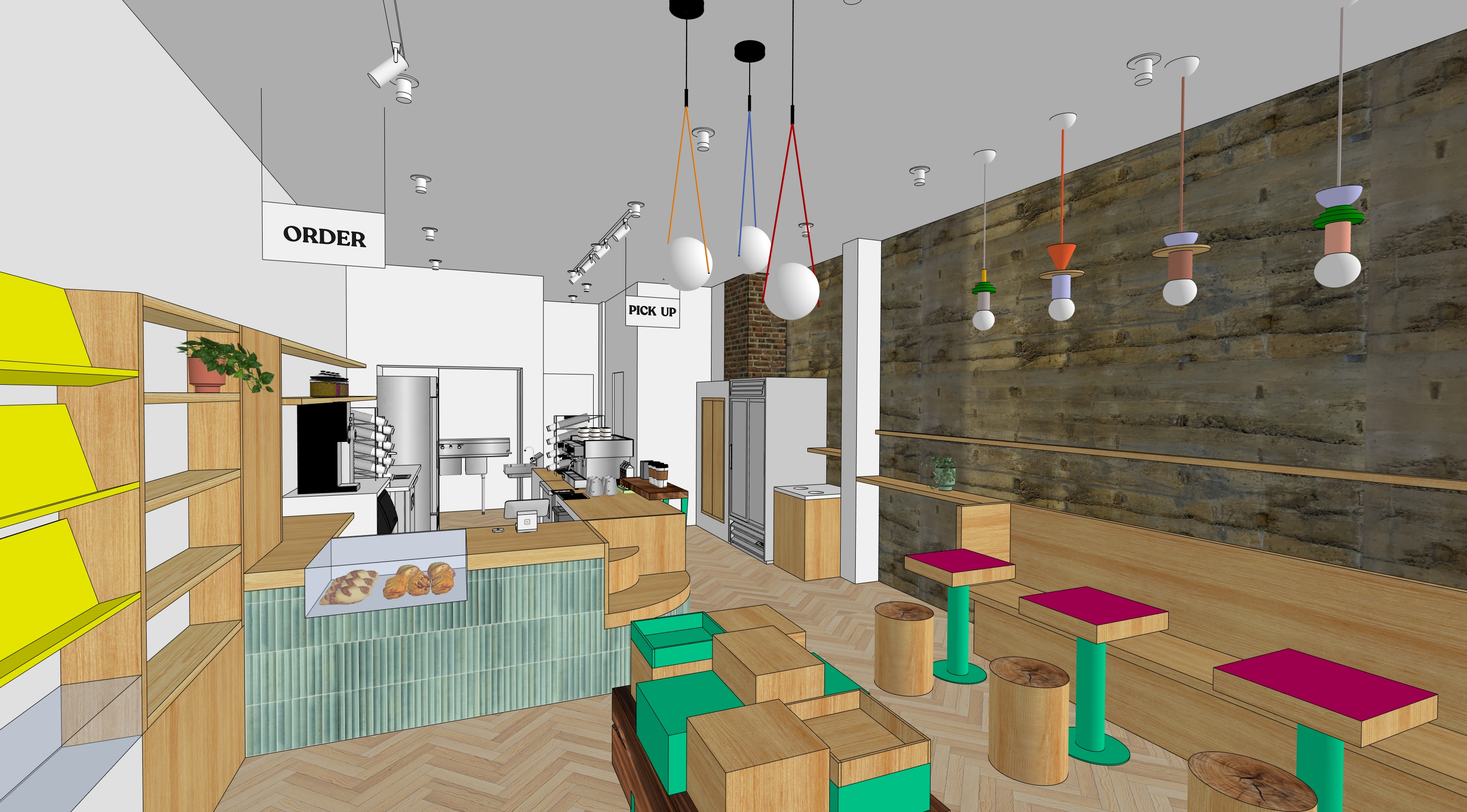 this is an interior view of a coffee shop the ordering counter has tile on its facade and the furniture is oak and jade green powder coated metal the left of the room has a small area of yellow shelving show the yellow and wood shelving with stationary products on it the serve line has a bakery case and a lower area on its right corner where more stationary products should be displayed