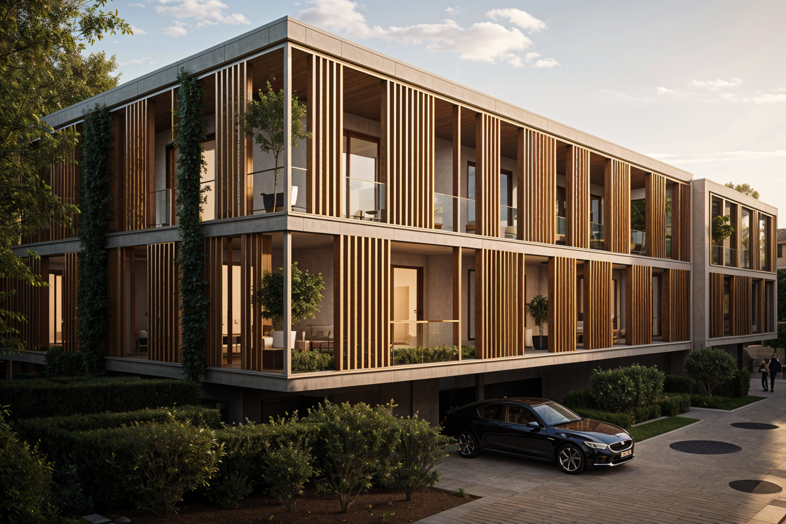 exterior shot insert vertical timber elements shaders to protruding terraces architecture