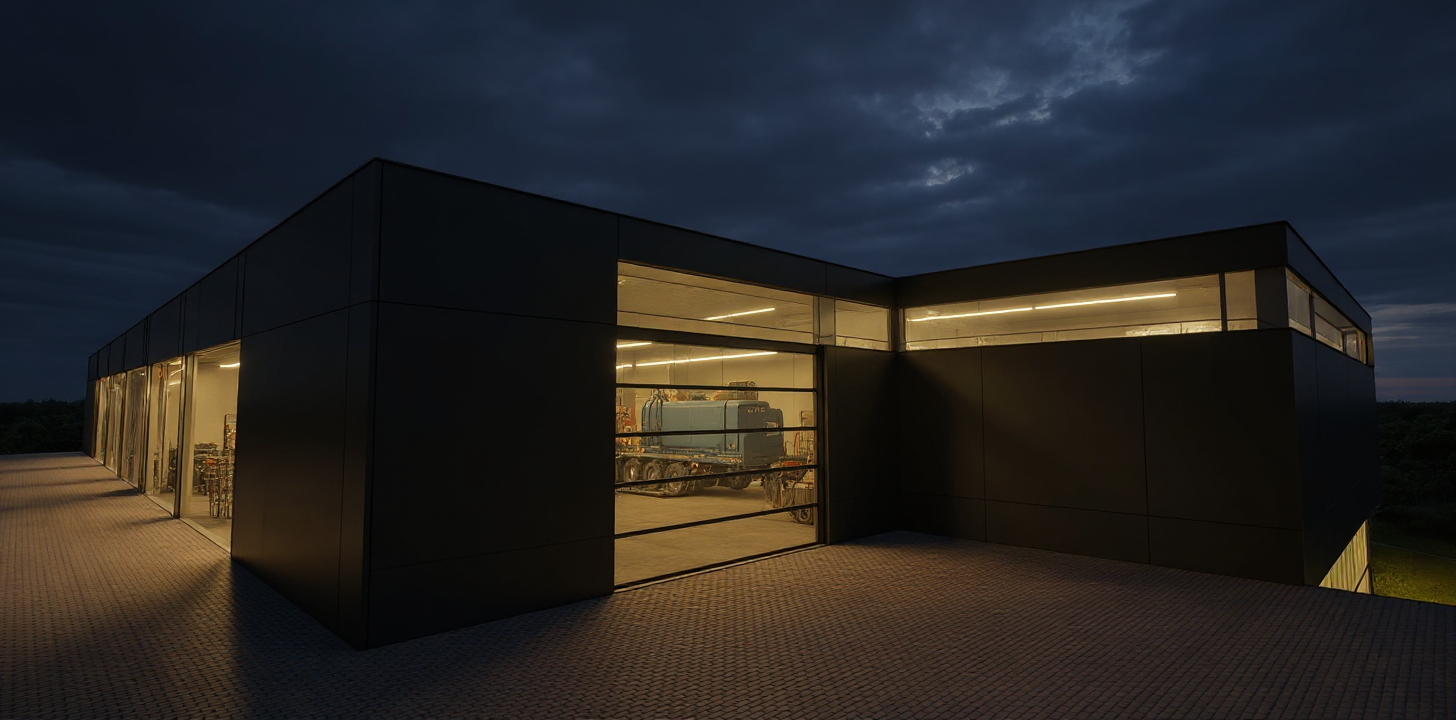 modern warehouse archutectural visualization vray render professional light setup led light large loading park lift and truck