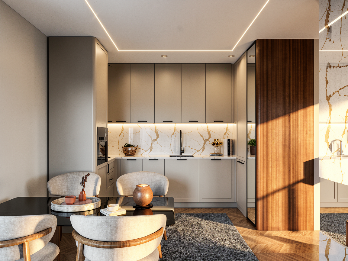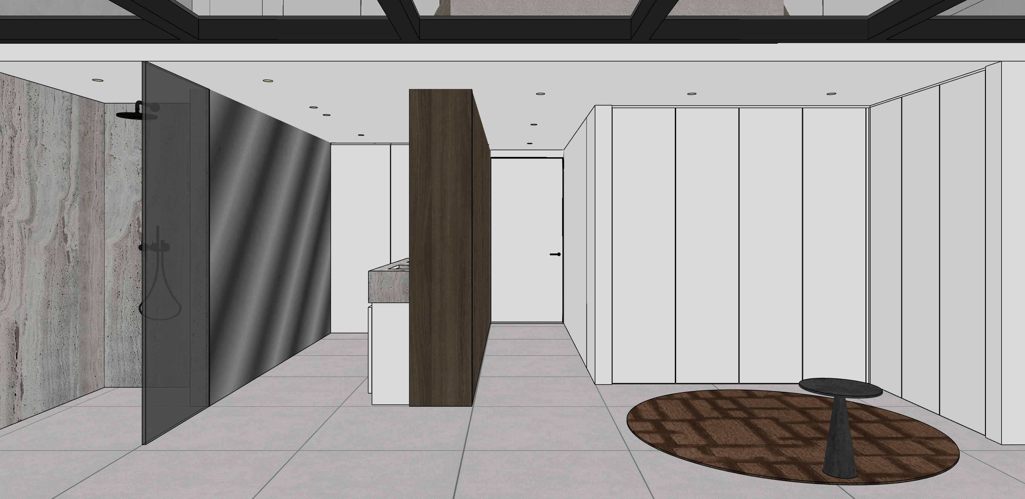 create a high end architectural interior realistic render calm and refined atmosphere soft natural daylight neutral warm palette balanced tones no orange cast diffused light with soft shadows subtle contrast natural color accuracy emphasis on materiality and texture tactile surfaces minimal styling clean architectural lines integrated design serene and timeless space depth and layering cinematic softness slightly desaturated tones photorealistic 35mm lens soft color grading quiet luxury emotional balance breathing space no harsh lighting no strong color cast no oversaturation maintain 100 of the geometry materials colours and layout with a sharp photorealistic result add more natural daylight most important materials warm grey ceramic tiles 90 x 90 cm fumed grey mirror shower glass open pore travertine titanium carpentry walls doors matt white add light to the ceiling spots