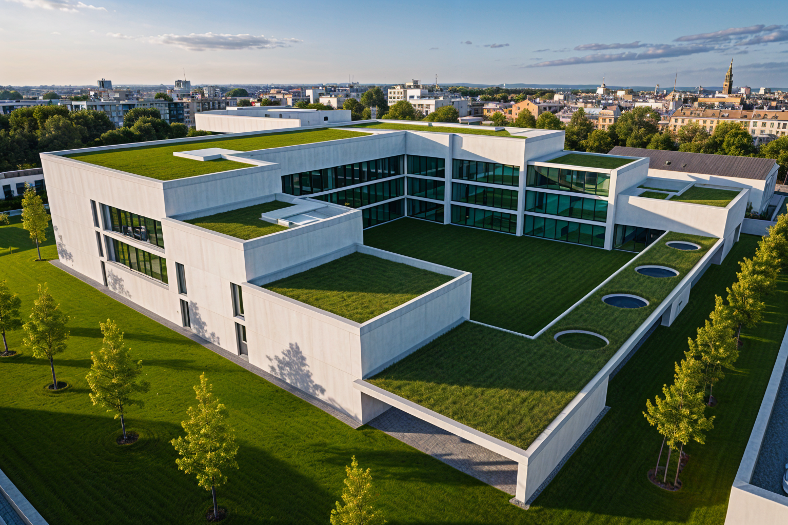 richard rogers aerial shot the modernist white building is surrounded by low greenery lawn and small trees the building s facade is white plaster with balconies and dark balustrades big windows on elevation grass on a roof architecture