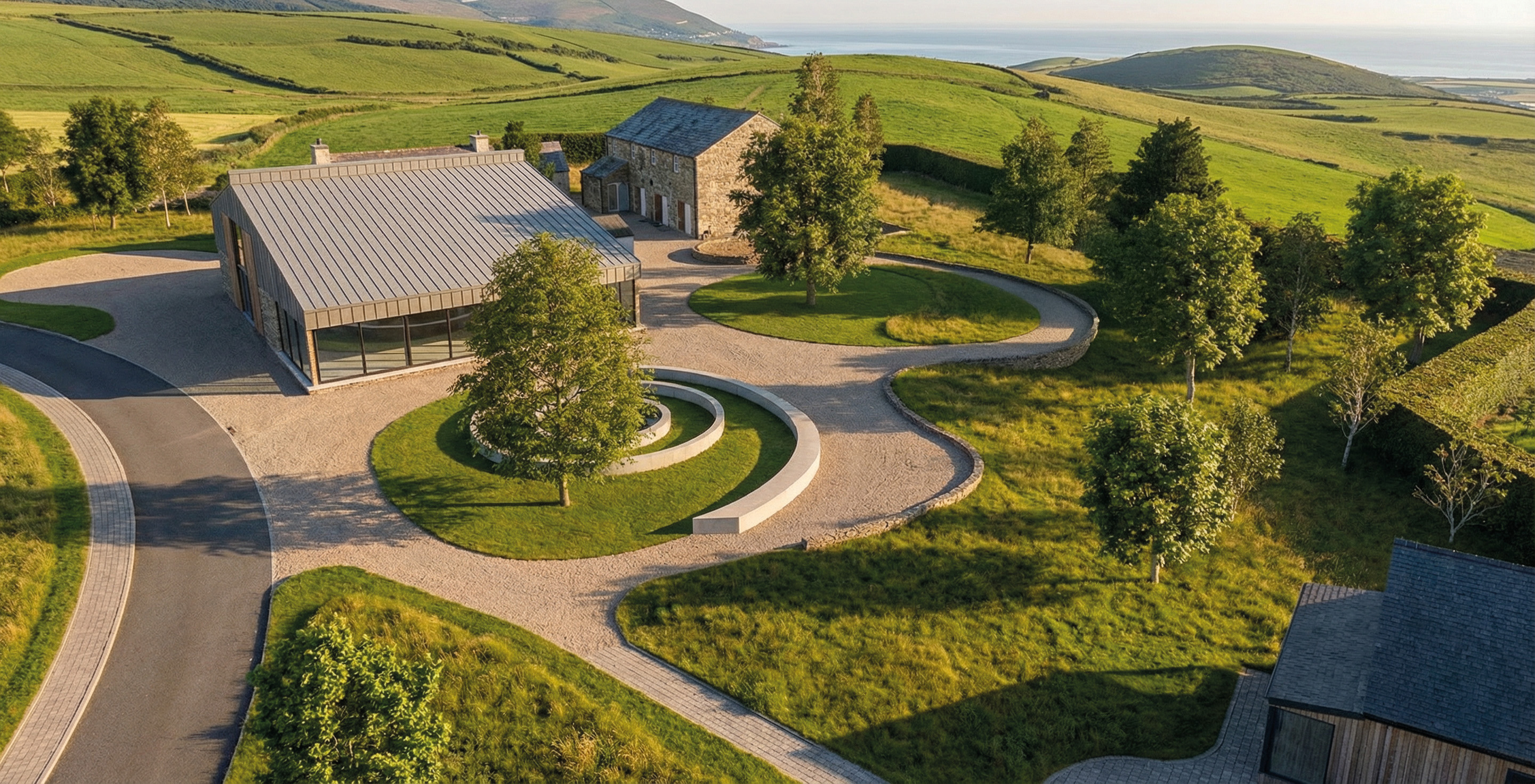 exterior shot photorealistic aerial render of nano banana wellness cabin resort northern ireland use this sketchup masterplan layout exactly replicate the precise positioning of every cabin and all winding pathways replace every green yellow blue and orange marker pole with a full mature native tree oak birch rowan hawthorn and scots pine at appropriate scale with full canopy the hillside behind the resort planted densely with native woodland cinematic late afternoon light clear blue northern irish sky with scattered high white clouds low golden sun casting warm long shadows replace green and orange poles with trees deep emerald green grass warm timber tones pale stone paths blue grey water patchwork northern ireland farmland and gentle hills visible beyond resort boundary hyper photorealistic magazine editorial quality hasselblad h6d 50mm f 4 golden afternoon light 8k resolution unreal engine 5 lumen global illumination ar 16 9 style raw stylize 800 v 6 1 quality 2 negative prompt marker poles coloured posts construction markers sketchup style cartoon cgi plastic flat lighting overcast foggy tropical trees palm trees blurry watermark fake hdr distorted buildings generic hotel