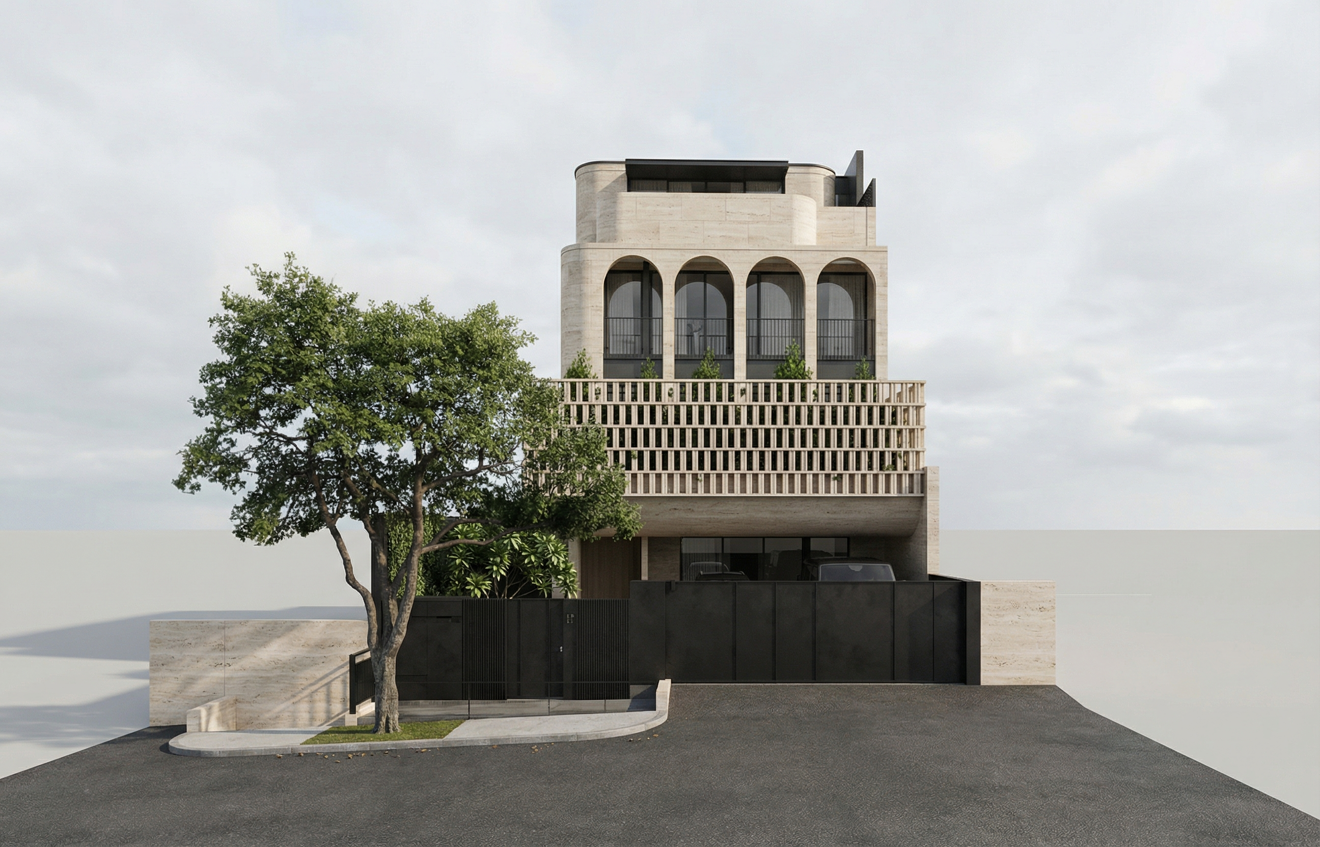 render a photorealistic 3d perspective of this house in cairns queensland australia reference the current material style just enhance them keep model geometry the same windows doors roof walls garage door pavement driveway make a lush vegetation that looks native to cairns do not change the view only enhance the current materials and make the landscape nicer vegetation detailed textures in the wood siding and glass reflections and a vibrant clear sky with light atmospheric depth render in hyper realistic architectural visualization quality 8k resolution