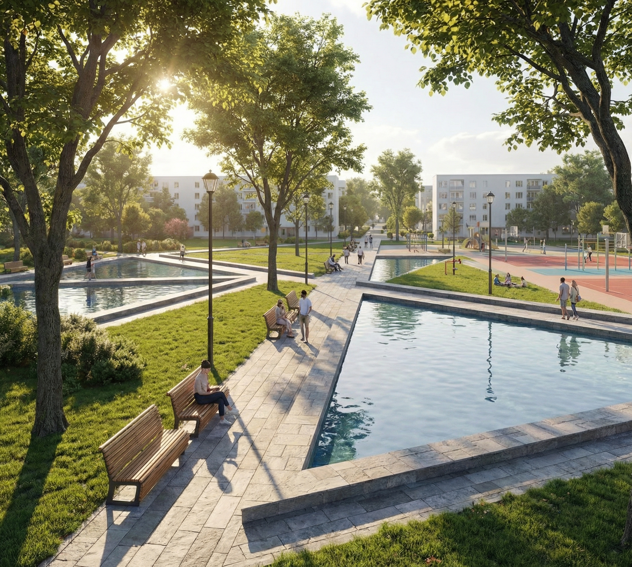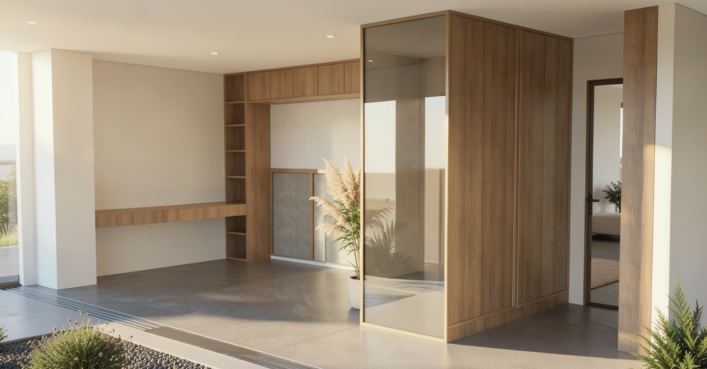 luxury high rise residential hospitality lounge interior long rectangular open layout divided into distinct experiential zones human centered design warm residential club atmosphere layered lighting with table lamps and architectural sconces matte oak lvt flooring vertical oak slat feature walls breaking up long proportions soft taupe plaster walls high performance acoustic panels integrated seamlessly flexible movable furniture modular seating with hidden casters high communal tables with sculptural wood tops upholstered benches versatile stackable chairs large neutral wool rugs defining zones intimate library nook with built in shelving chicago condominium setting extension of home aesthetic timeless edge design sophisticated but warm realistic scale photorealistic architectural rendering natural daylight from one side cinematic realism without exaggeration enscape v ray d5 lumion level realism ultra realistic materials soft shadows shot on 24mm lens eye level ar 16 9 style raw v 6 quality 2
