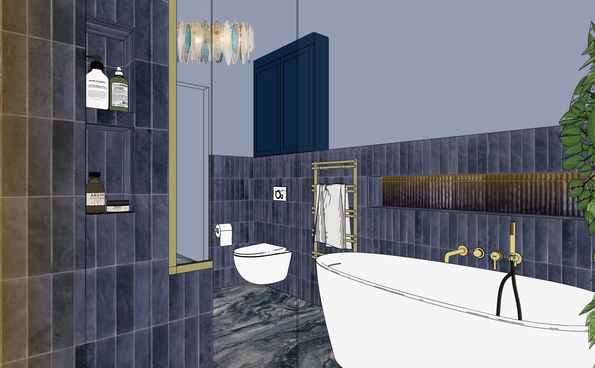 nie zmieniaj geometrii perspektywy tekstur mebli kolor w nie dodawaj adnych element w dekoracyjnych ani mebli uj cie jest jakby z pod kabiny prysznicowej po lewej stronie wida un wiat a od pionowego profilu led we wn kach nad wann jest pod wietlenie led szafki s lakierowane matowym lakierem wc i wanna s bia e matowe w azience jest tylko jedno ma e okno z prawej strony poza kadrem wn ki pod prysznicem s niepod wietlone kafelki s polerowane w azience jest do ciemno klimatycznie jak w spa yrandol jest wy czony p ytki pod ogowe s matowe przycisk wc jest bia y matowy popraw wizualizacj eby by a hiperrealistyczna