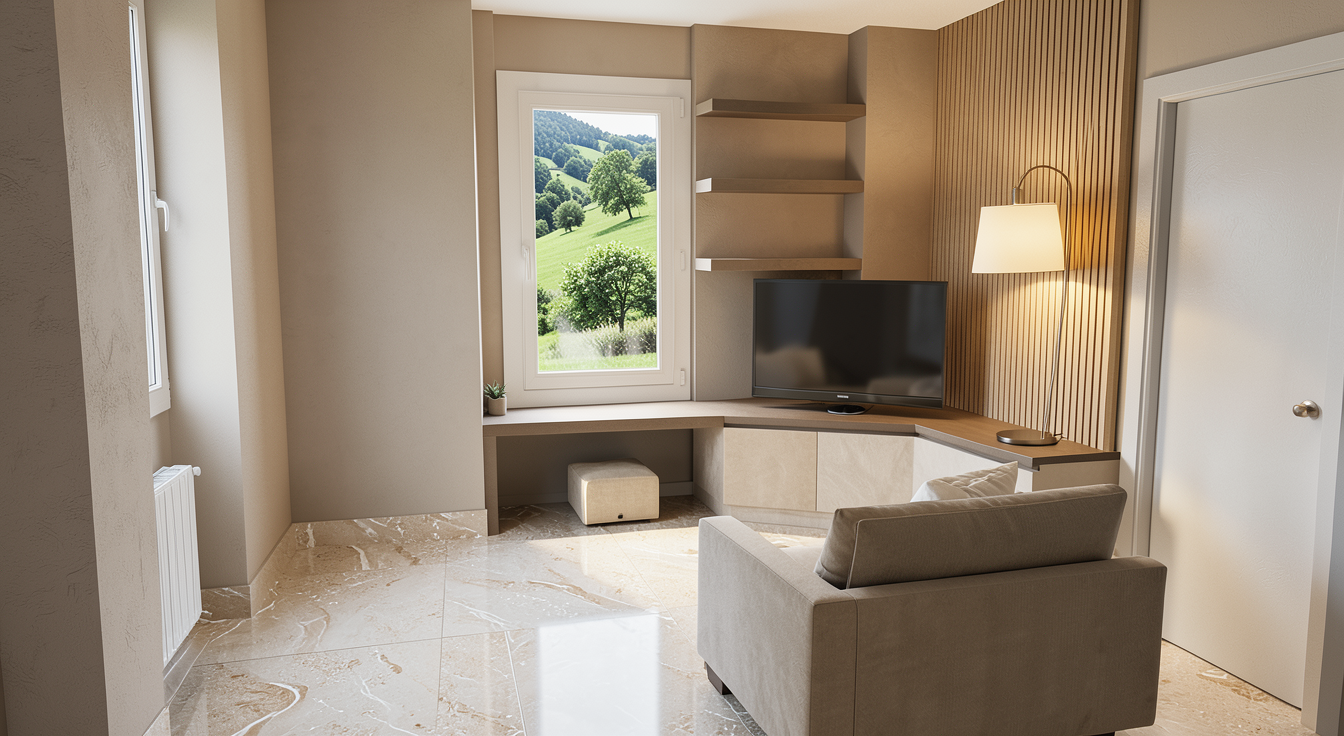 create a cozy and modern bookstore interior use warm honey colored wood for the bookshelves and ceiling incorporate white accents on the shelves and display stands for a clean sleek look the floor should be mosaic style with natural stone colors beige cream and brown shades add a vibrant blue accent wall for contrast ensure the lighting is soft yet bright with modern white ceiling lights the atmosphere should feel inviting and intellectually stimulating perfect for book lovers
