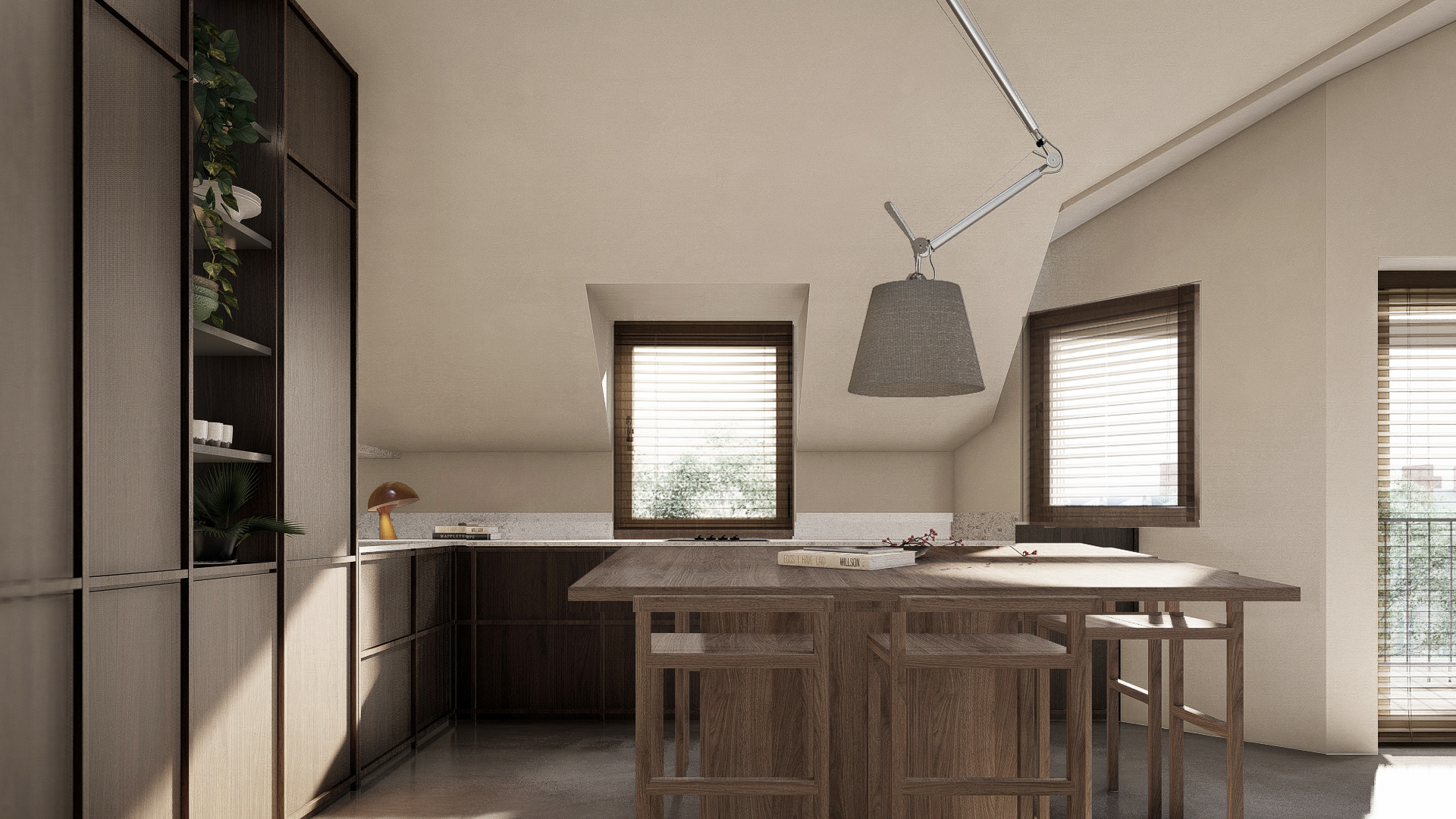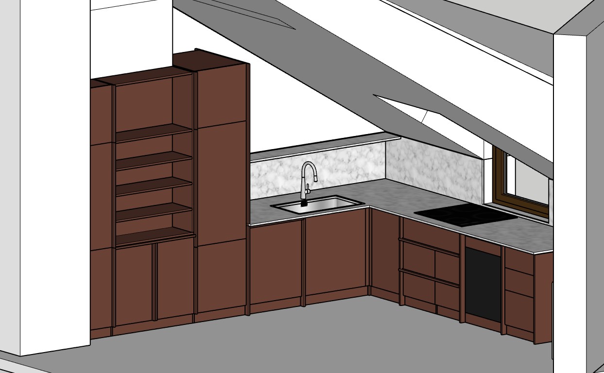 exterior shot a cozy attic kitchen with rich mahogany cabinets a marble backsplash and sleek gray granite countertops the ceiling is a bright white to enhance natural light from the window framed in warm brown wood the floor is a soft gray complementing the overall modern and elegant atmosphere the sink features a shiny chrome faucet and there s a smooth black stove surface creating a harmonious and inviting space