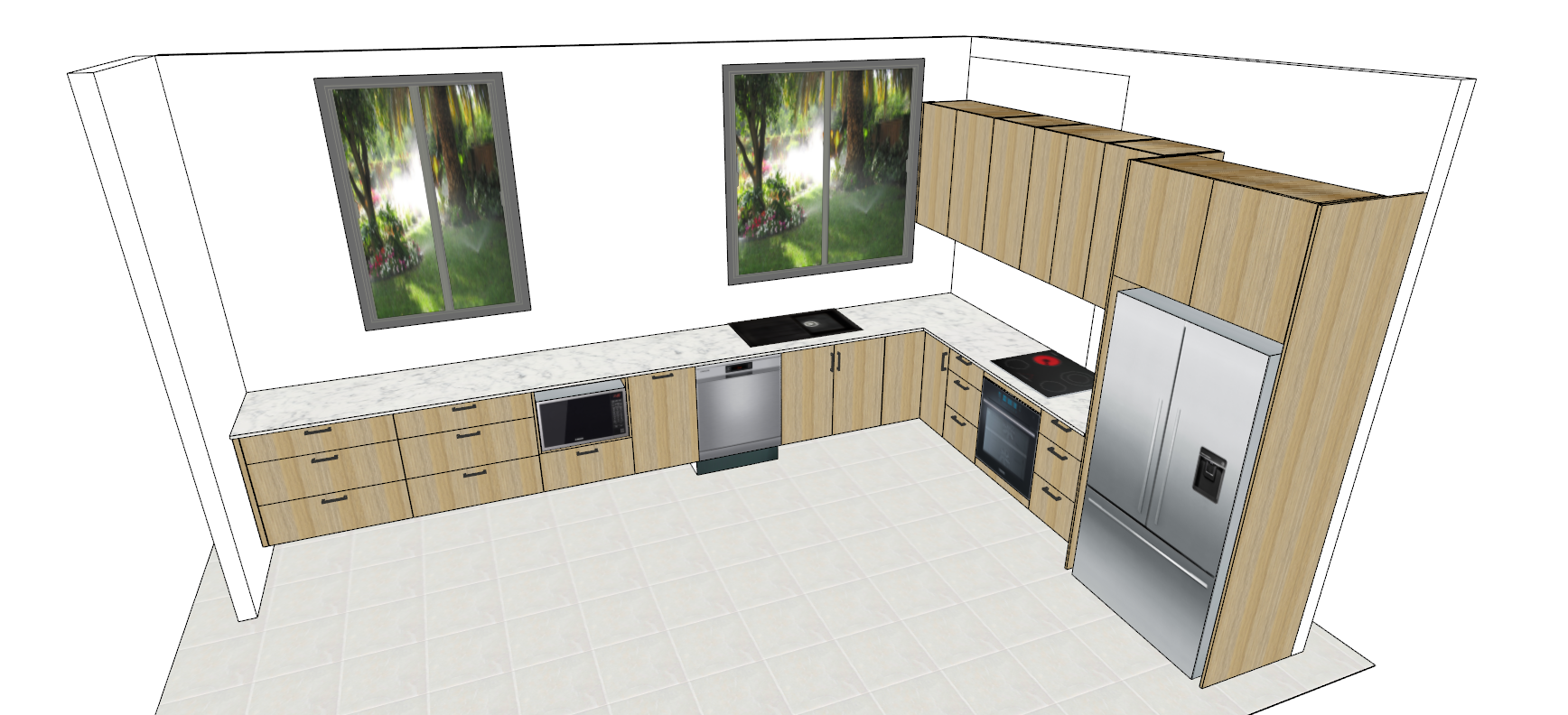 natural oak cabinets with black handles marble look top