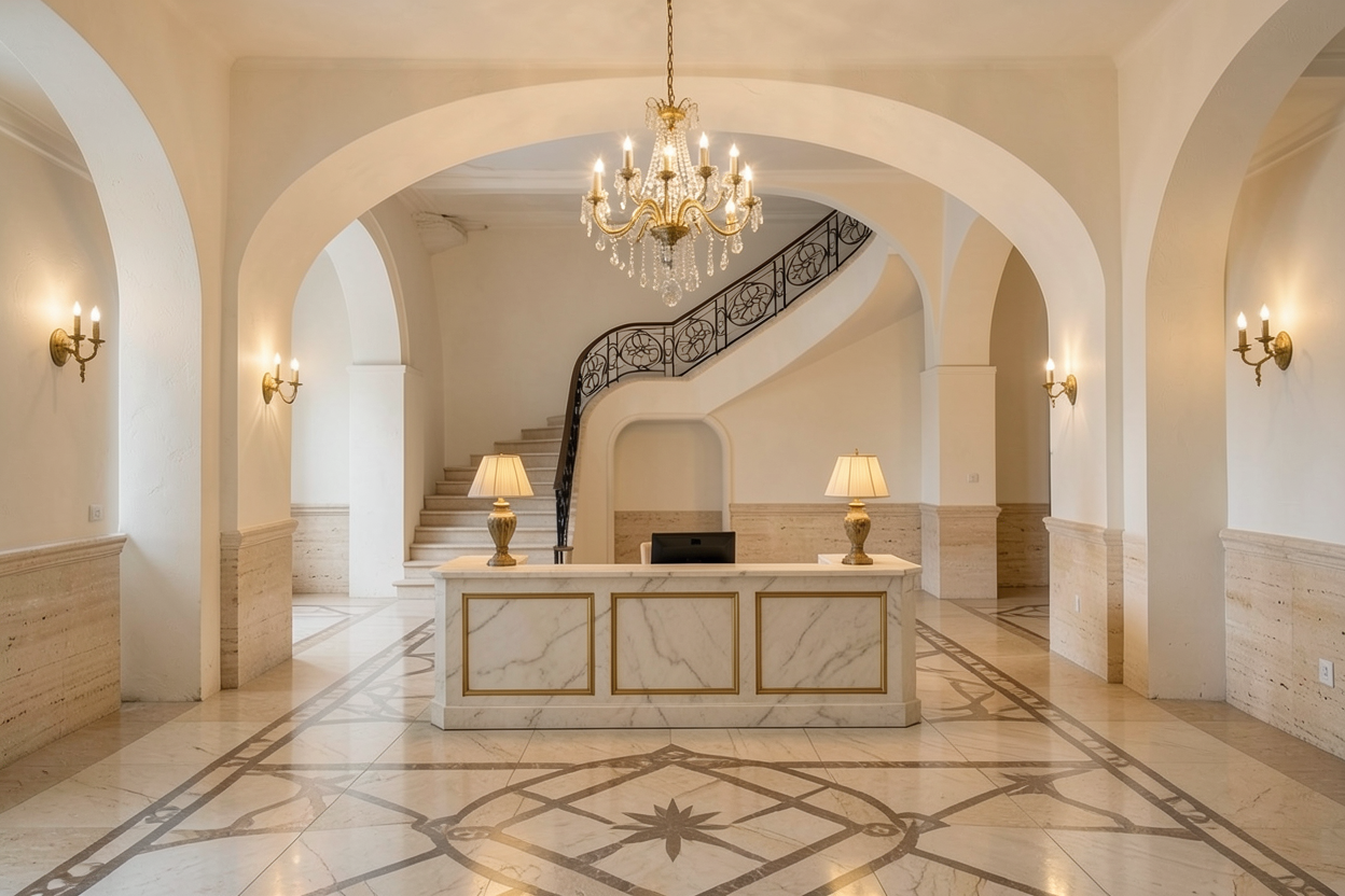 style ultra luxurious classical heritage grand hotel inspired by iconic european palaces and eichholtz signature interiors materials walls finished in refined milky white stucco with subtle classical moldings and depth lower wall cladding in premium beige travertine with elegant stone profiling floor in polished marble with rich geometric inlays and brass detailing reception desk designed as a monumental centerpiece clad in premium marble with classic paneling carved detailing and brushed antique brass inlays staircase emphasized as a sculptural element stone steps with ornate wrought iron balustrade in dark bronze lighting large statement chandelier inspired by eichholtz designs layered brass arms crystal or alabaster elements sculptural and opulent additional secondary chandeliers or decorative ceiling pendants aligned symmetrically elegant wall sconces in antique brass with warm glow on columns and arches integrated indirect lighting highlighting arches staircase curves and reception desk base furniture details luxurious eichholtz style table lamps on the reception desk with fabric shades and brass bases decorative consoles or sculptural accent pieces subtly placed near columns rich detailing no empty surfaces carefully layered decor no minimalism refined opulence controlled richness atmosphere highly prestigious ceremonial and dramatic luxury grand palace hotel ambiance strong visual impact unmistakably autograph collection warm golden light depth contrast and a powerful sense of arrival