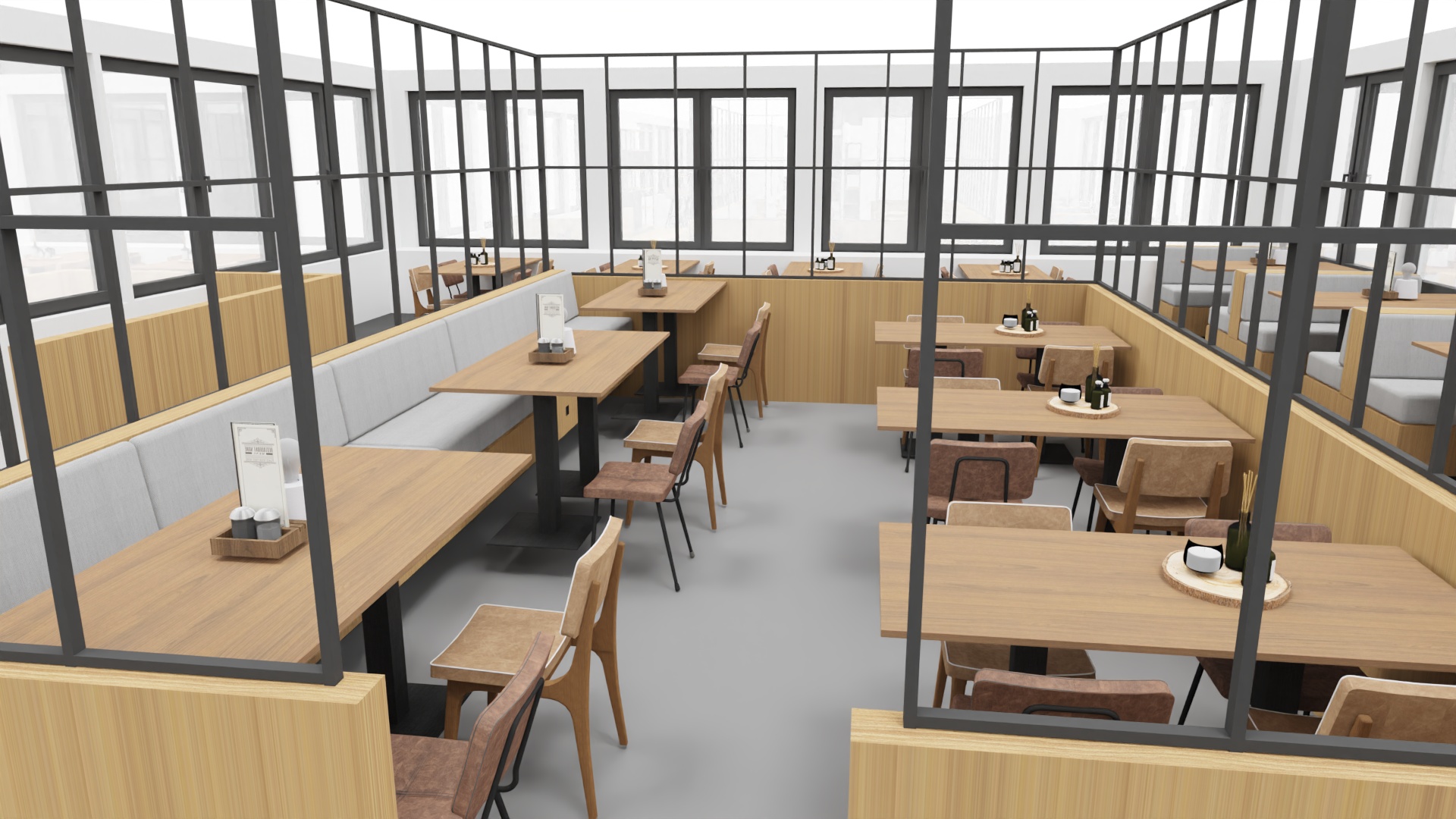 a stylish restaurant interior in a cozy evening atmosphere designed in industrial style with warm oak accents tables feature solid oak wood tops with sturdy black steel legs surrounding the tables are light upholstered chairs providing a soft contrast to the industrial look and ensuring comfort the floor has a modern concrete appearance and the ceiling is bright to enhance the sense of space the concept centers around wine elegant wine racks a central wine bar and fine glassware emphasize this focus warm lighting indirect illumination and welcoming materials create a comfortable and inviting ambiance architecture