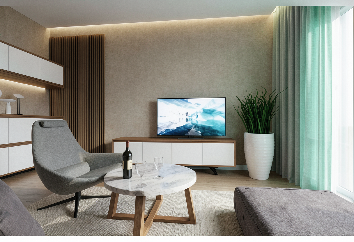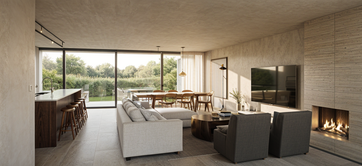 make the kitchen realistic to the render styler with walnut cabinets hanging halfway over the counter and fully above the fridge then have a tan countertops