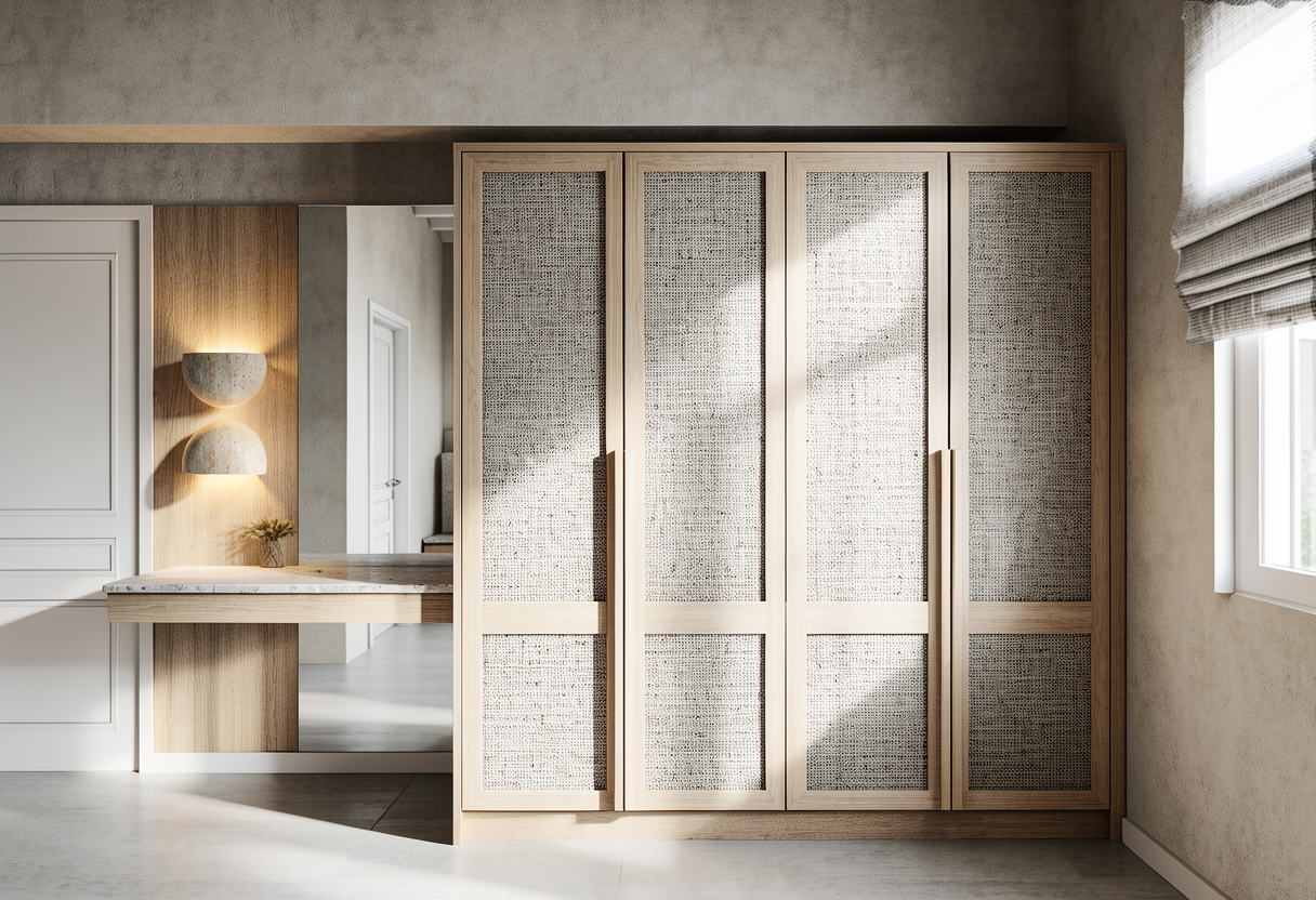 the round wall sconces are made of travertine stone indirect light create a realistic and professional render of a room with a calm and atmospheric the lighting should feel balanced and natural enhancing the realism of the materials light oak wood