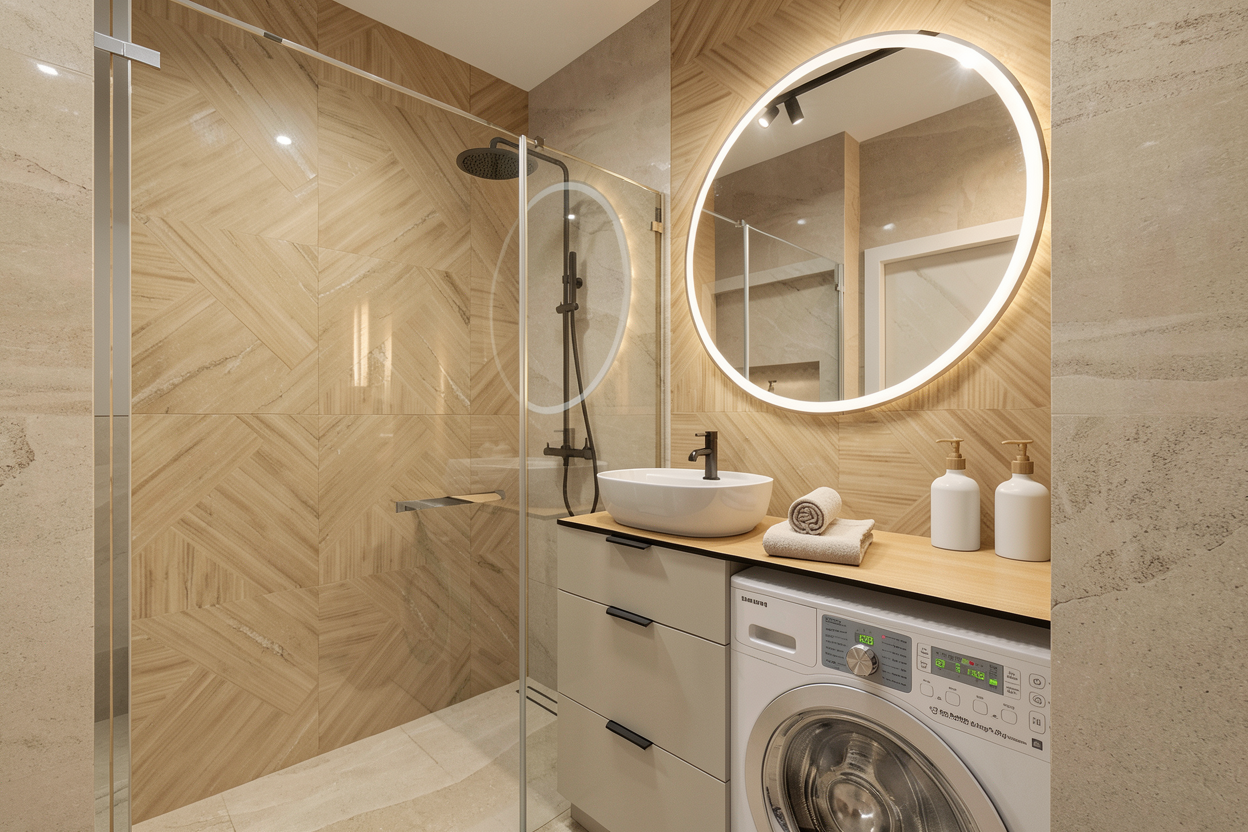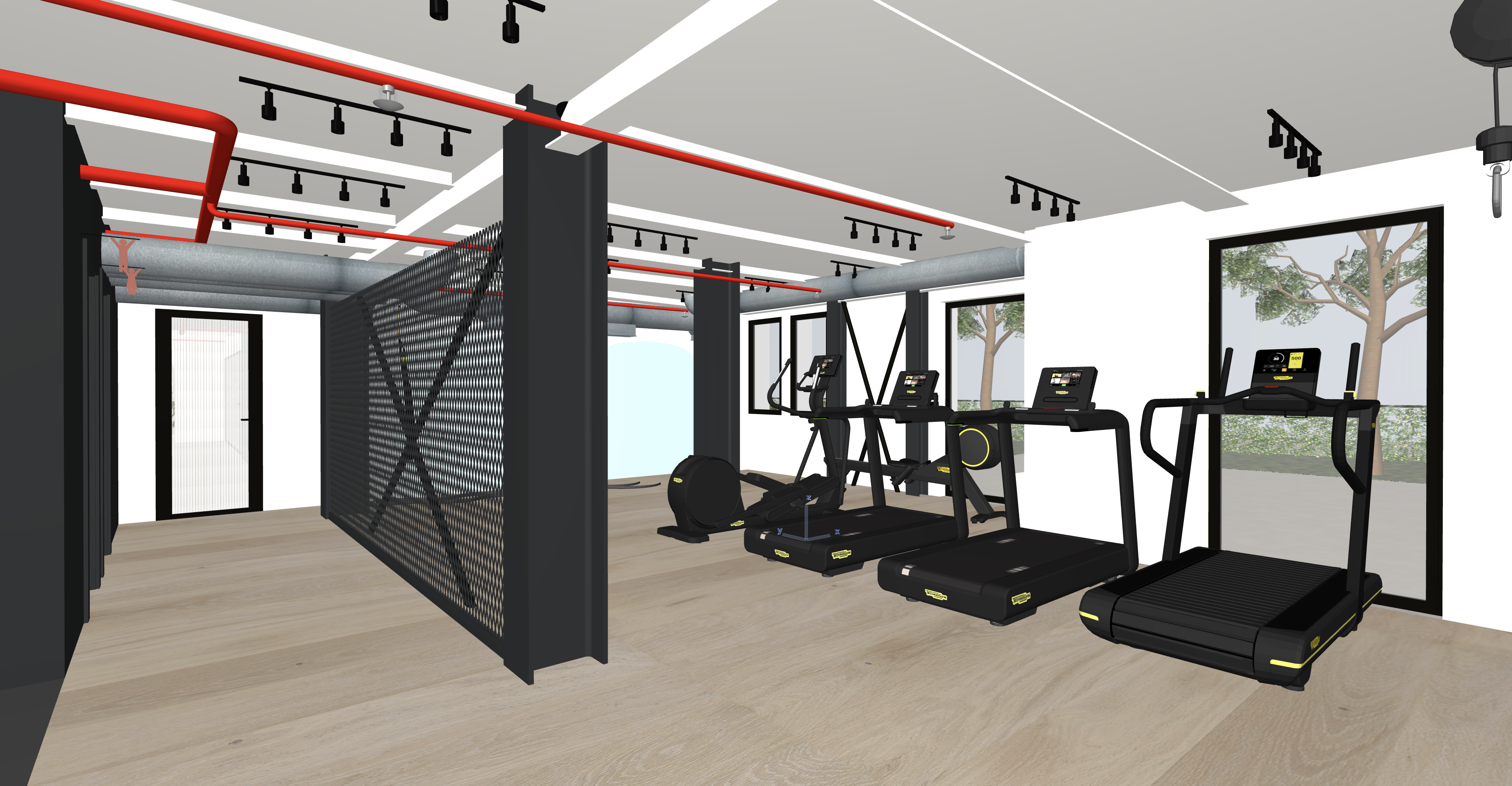 e una palestra a terra abbiamo un pavimento in parquet in rovere chiaro continuo a liscio la porta di ingresso in vetro cannettato solo la parete degli spogliatoio nera i pilastri in ferro sono neri non ci sono strip led come illuminazione come illuminazione abbiamo dei binari neri con faretti neri a luce calda fai entrare un p di luce naturale dalle finestre metti qualche oggetto come zaini palestra attrezzi e borracce