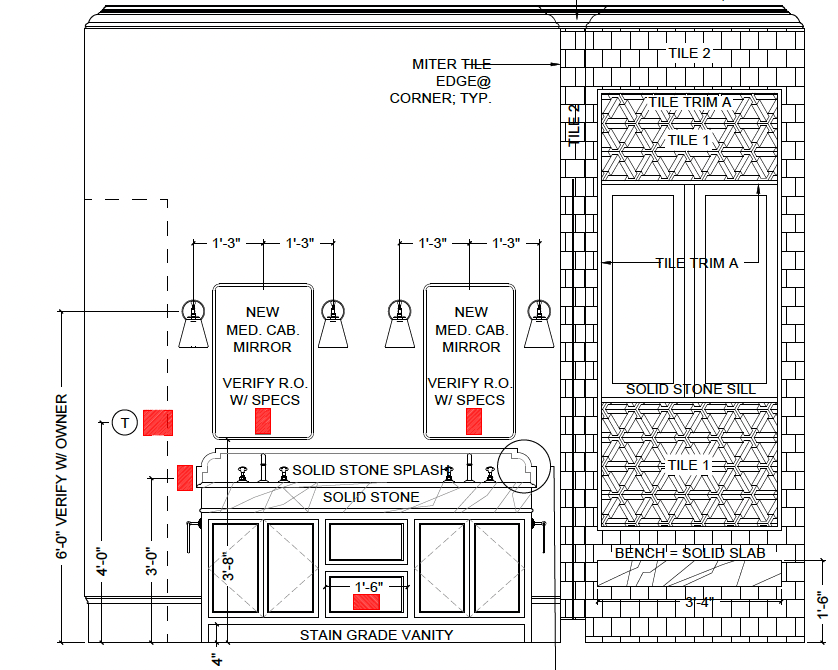 interior shot stain vanity with white creaming counter brass sconces