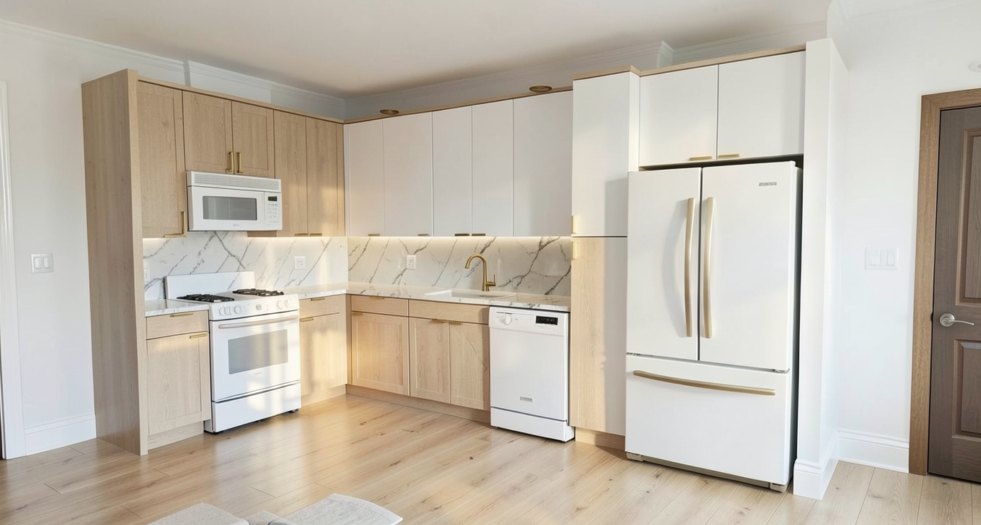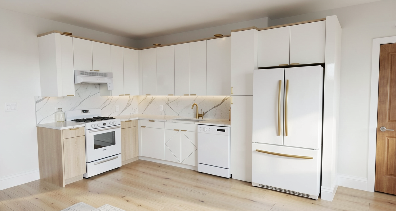 render this kitchen with 5 light oak base cabinets 7 white upper cabinets cabinets around refrigerator to be light oak brass cabinet door handles brass sink faucets quartz countertop with very slight grey vein quartz backsplash with very slight grey vein appliances to be ge caf model in matte white appliances t have brass handles flooring to be pale oak walls to be painted flat white base molding to be painted glossy white