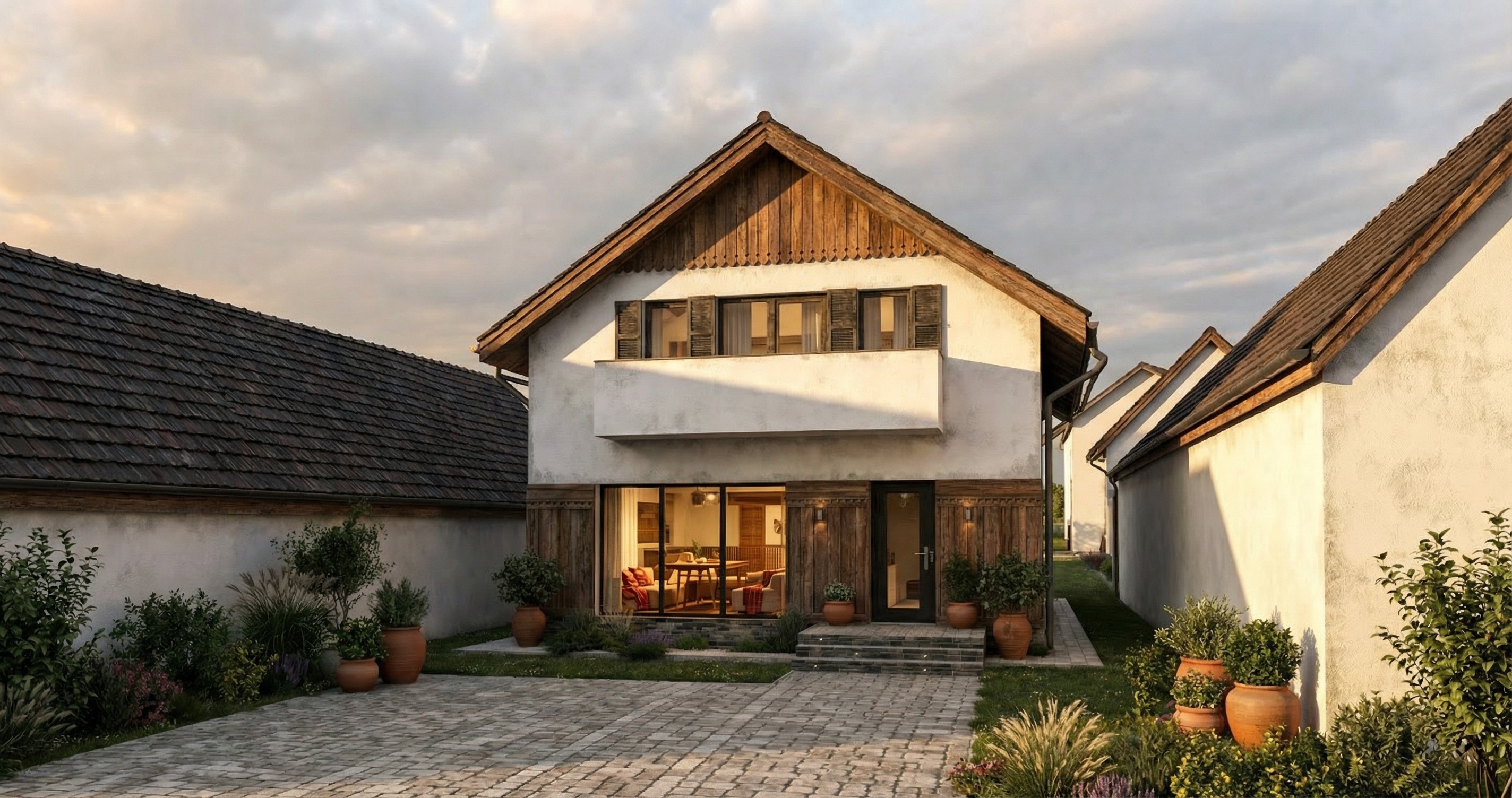 keep all existing geometry proportions and openings unchanged do not modify neighboring buildings preserve realistic lighting and materials modify only on the central building set all window and door frames joinery to dark brown pvc ensure the frames are slim consistent for both windows and doors modify only on the left building change the roof covering to metal tile roofing tile shaped sheet metal dark brown color set the exterior wall finish to warm orange plaster natural slightly desaturated tone not bright