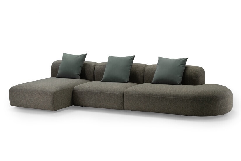 modern living room the sofa is against the wall light wood stripped panel neutral textured rug under the sofa and high quality black metal and marble coffe table modern hanging lights hanging from the cieling and some green leafy plant