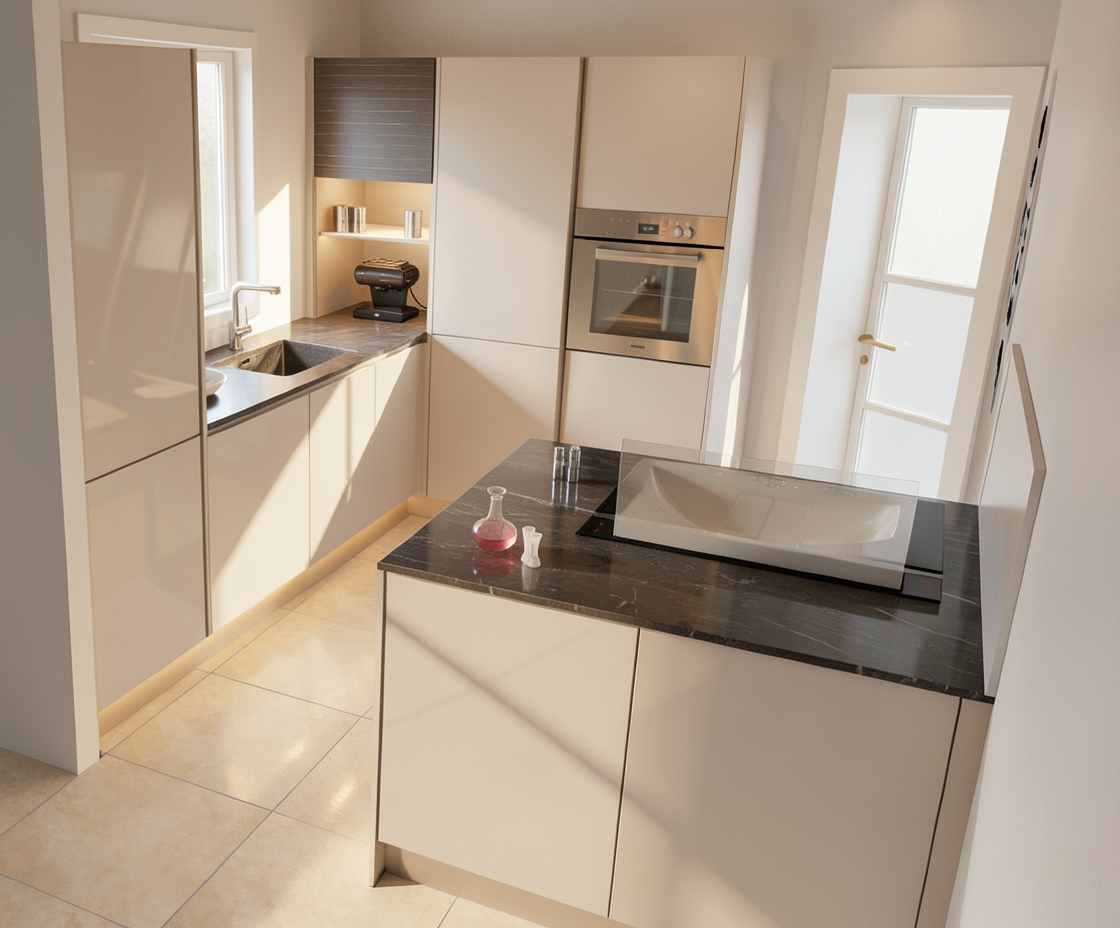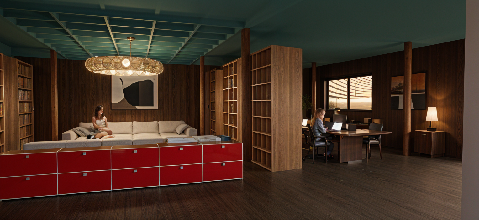 use the uploaded sketchup model as absolute reference strict preservation mode do not modify architecture do not change geometry layout proportions or camera do not add remove or redesign furniture do not change materials colors or textures do not alter ceiling grid columns walls or floor keep every object exactly where it is lighting enhancement only the render must look like the same model only realistically illuminated lighting concept warm atmospheric evening interior 1 ceiling suspended lamp soft warm diffused glow 2700k fabric texture softly illuminated acts as ambient light source only not overexposed 2 bookshelves lighting hidden linear warm led strips above shelves continuous indirect light washing down the books soft and subtle no visible fixtures 3 work desk lighting turn on existing table lamps warm focused task lighting illuminating laptops and work surface natural falloff calm working atmosphere 4 general ambience cozy evening interior soft cinematic shadows balanced exposure no dramatic contrast warm scandinavian mid century mood people very subtle integration maximum 3 people one person reading calmly on sofa one or two people working quietly at the desk with laptops relaxed reflective poses do not add extra chairs or furniture do not block architectural elements realism rule enhance lighting realism only no redesign no reinterpretation no new objects photorealistic architectural visualization natural materials preserved exactly as modeled