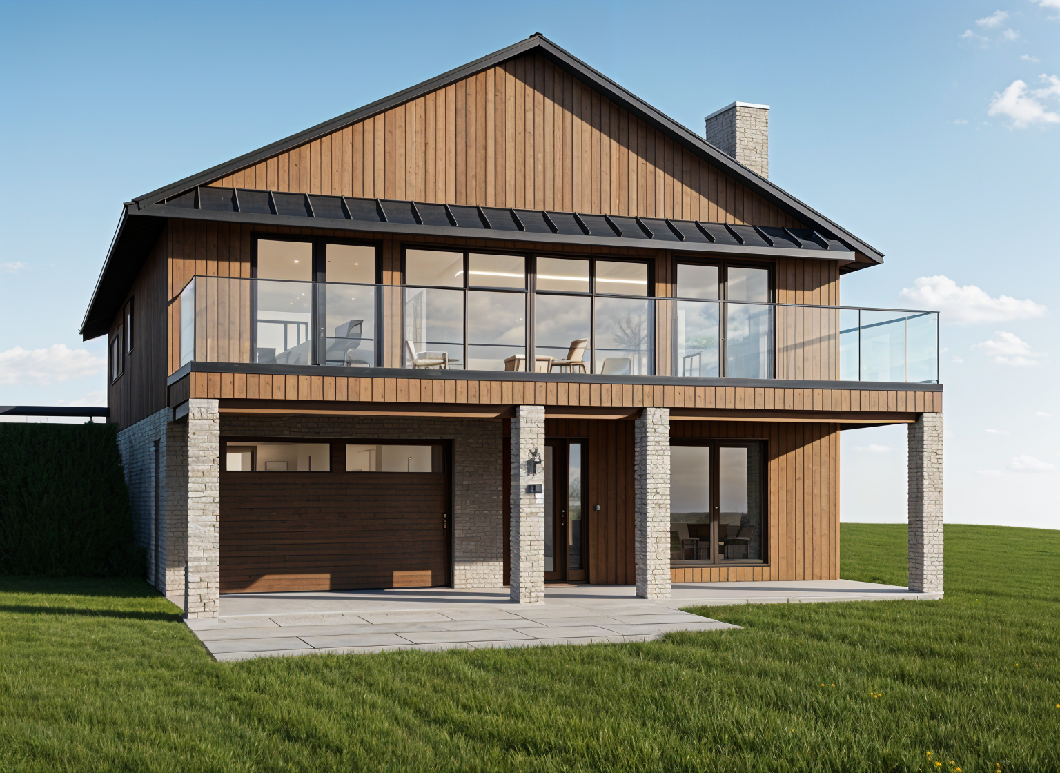 make the paint color a monochromatic light beige located in a grassy field with forest in the back forty the lawn around the house is mowed make this look realistic the sun is shining from behind the house so shade the front