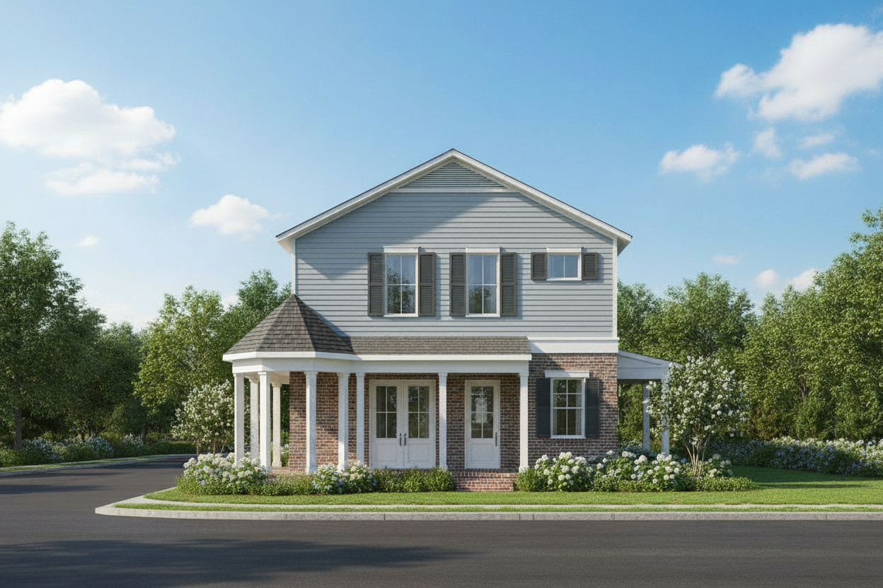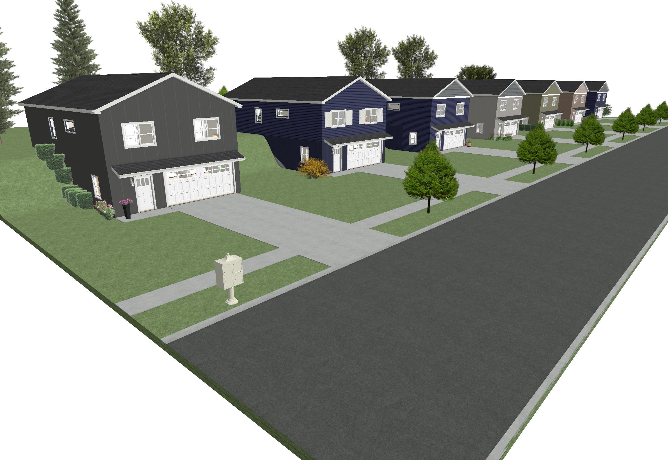 render a serene suburban neighborhood with modern houses each with similar tones of exteriors in shades of charcoal gray navy blue and olive green beige incorporate contrasting white trim around the windows and doors highlight neatly manicured lawns in a fresh vibrant green arrange the houses along a smooth asphalt road under a clear bright blue sky with fluffy white clouds create a peaceful inviting atmosphere with soft natural lighting and add lush tall trees in the background to enhance the tranquil suburban setting