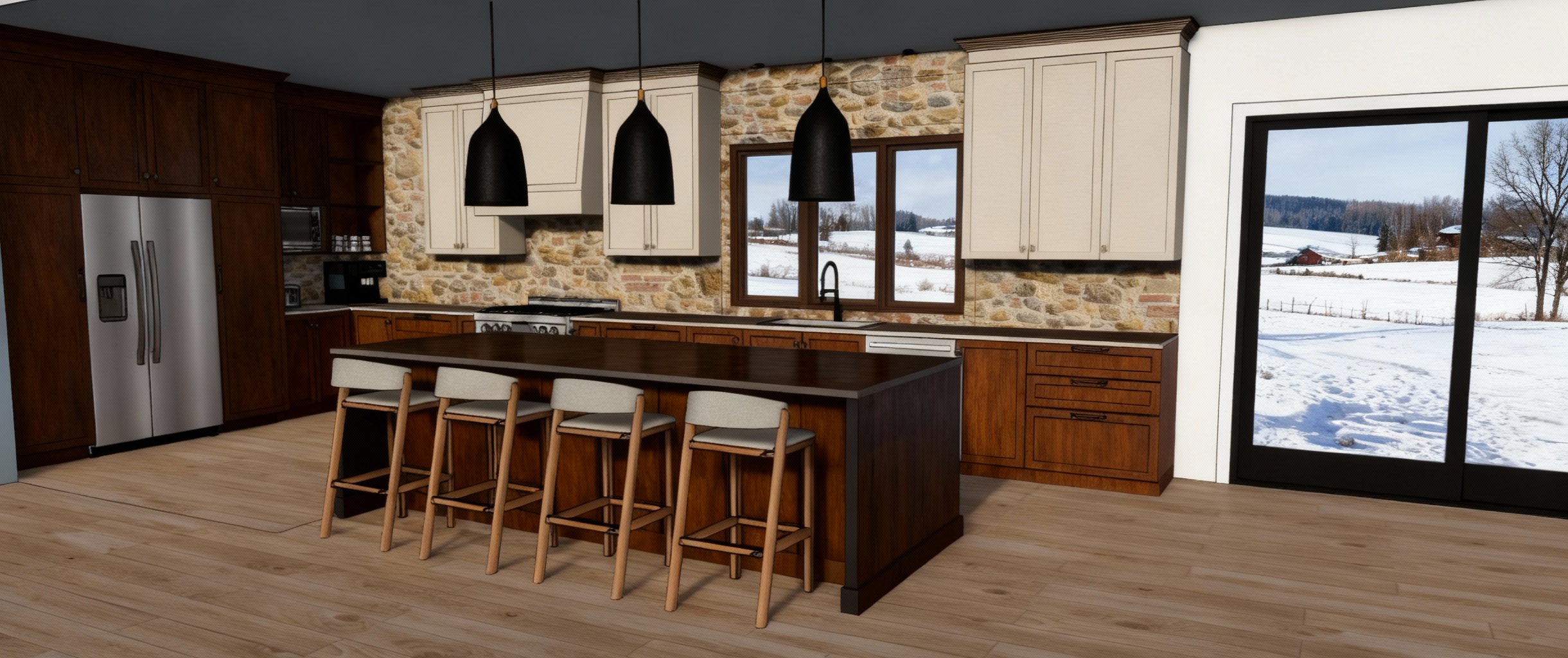 replace the background with a backyard view add lights to the wall scones but keep the structure exactly