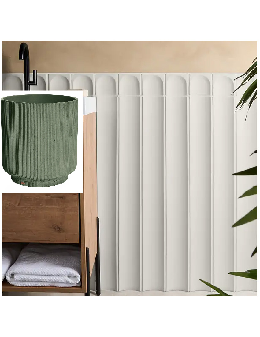 exterior shot japandi and moody powder room with green concrete vessel sink white 3d tiles up to half wall leafy dark green and blue wallpaper on top part of the wall oak wood flooring high ceiling