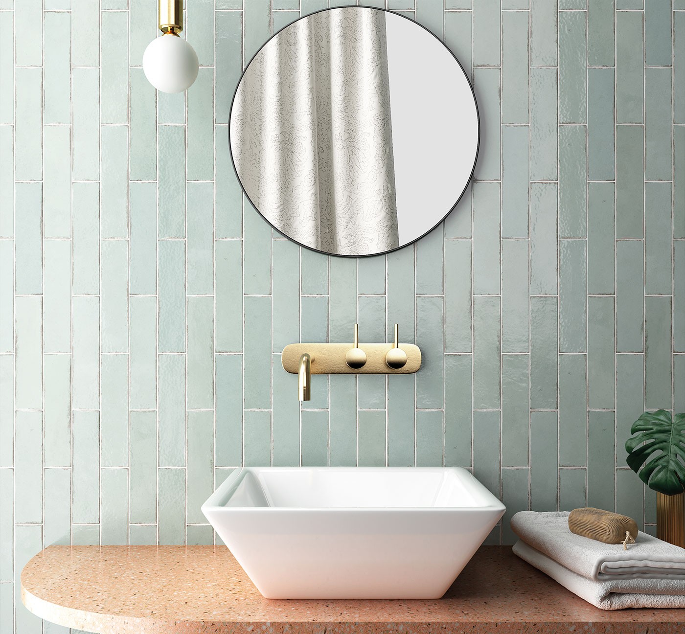 use the primary input image to create a traditional british bathroom design and antique brass fixtures and fittings keep the wall tiles as they are do not include the wicker basket include a brass framed mirror a burlington style sink and a roll top bath ensure the image shows a patterned floor tile design that is identical to the secondary input reference image