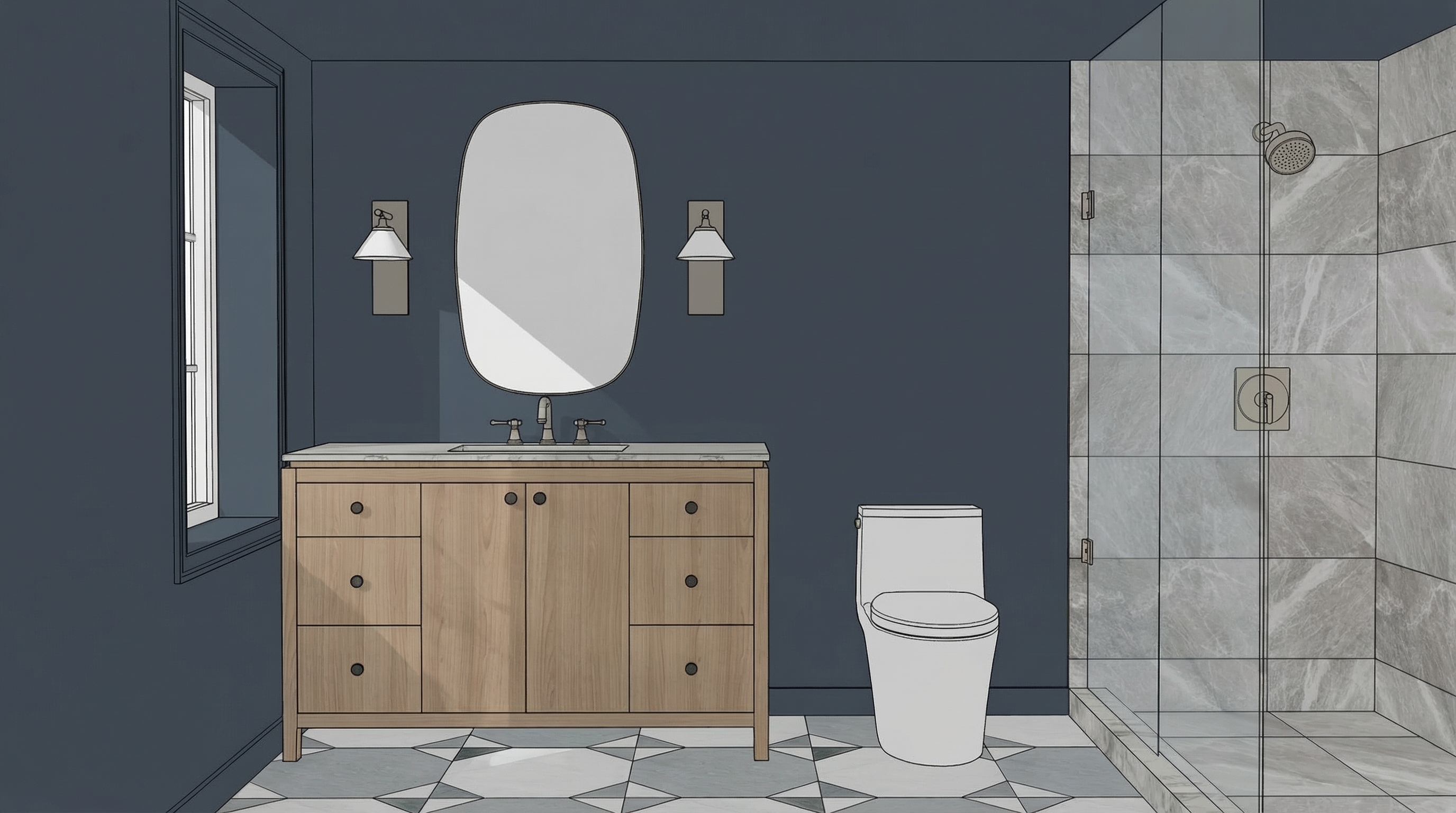 modern bathroom interior elegant and minimal design dark navy blue painted wall as the main background smooth matte finish light natural oak wood vanity cabinet with flat panel drawers and black round knobs white marble countertop with subtle gray veins and an integrated sink polished chrome faucet with classic cross handles above the vanity a tall rounded rectangular mirror with soft curved corners two symmetrical wall sconces with warm light and white fabric shades on both sides of the mirror creating soft ambient lighting on the right side a modern white one piece toilet with a clean minimalist design walk in shower area with large format gray marble tiles on the walls subtle natural stone texture clear frameless glass shower panel with minimal hardware modern chrome shower fixture with round shower head floor with geometric patterned tiles in white and gray tones forming a subtle decorative pattern soft recessed ceiling lights providing balanced illumination natural light entering from a window on the left side creating gentle shadows and realistic lighting contemporary interior design calm atmosphere high end residential bathroom realistic materials soft reflections architectural photography style ultra detailed 8k global illumination