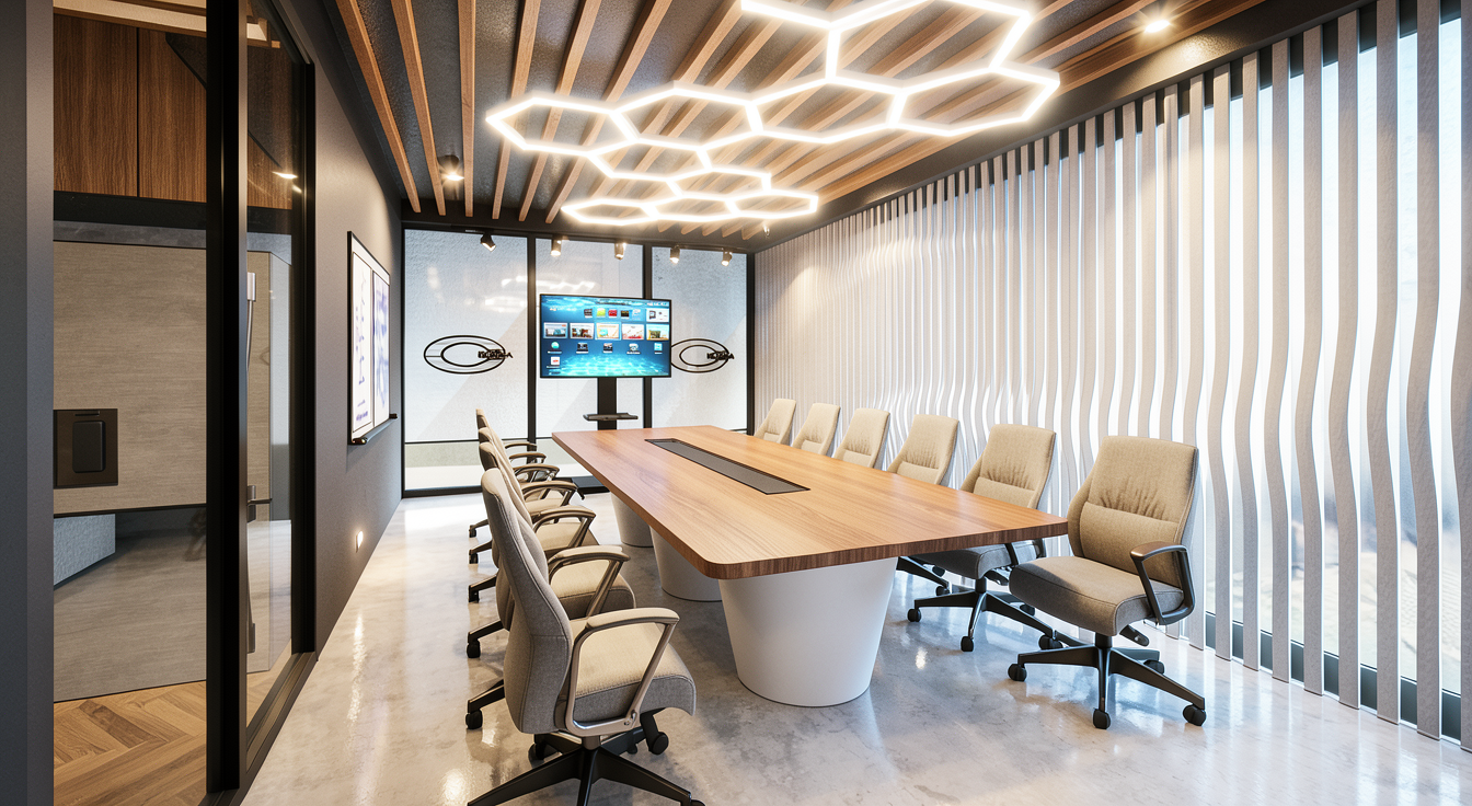 imagine a modern serene hallway in a sophisticated building the walls are primarily white with elegant navy blue accents strategically placed alongside each door to create a rhythmic pattern the polished light gray doors contrast pleasingly against the white walls the floor is a warm earthy brown adding a sense of grounded comfort subtle green plant stands line the hallway merging nature with design the hallway is illuminated by round recessed ceiling lights casting a soft inviting glow artistic photographs in calming pastel and sepia tones are displayed along the walls enhancing the tranquil and cultured atmosphere the overall mood is one of calm elegance and contemporary sophistication
