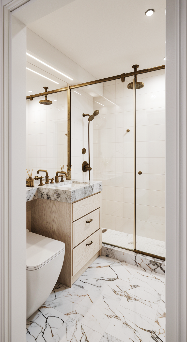 make the shower tile off white ceramic and taupe terrazzo flooring and countertop and white oak vanity without hardware and make the fixtures aged unlacquered brass