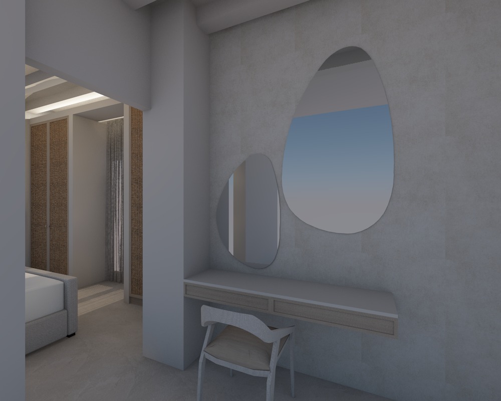create a high end photorealistic render of the bedroom from an alternative angle the wardrobe features a champagne toned wooden frame as shown in the reference with elegant woven cane raffia panels in a refined fabric finish the texture of the cane should feel premium tightly woven and sophisticated not rustic on the right side include a vanity area with pebble shaped mirrors mounted on the wall each with concealed backlighting that creates a soft halo glow the lighting should be subtle and realistic emphasizing depth and ambiance without overexposure style the vanity and surrounding surfaces with elegant decorative objects minimal sculptural pieces a refined tray perhaps a ceramic vase or a small plant maintaining a curated sophisticated aesthetic the overall mood should remain contemporary cohesive and luxurious with realistic materials soft shadows balanced contrast and a premium interior design magazine editorial look