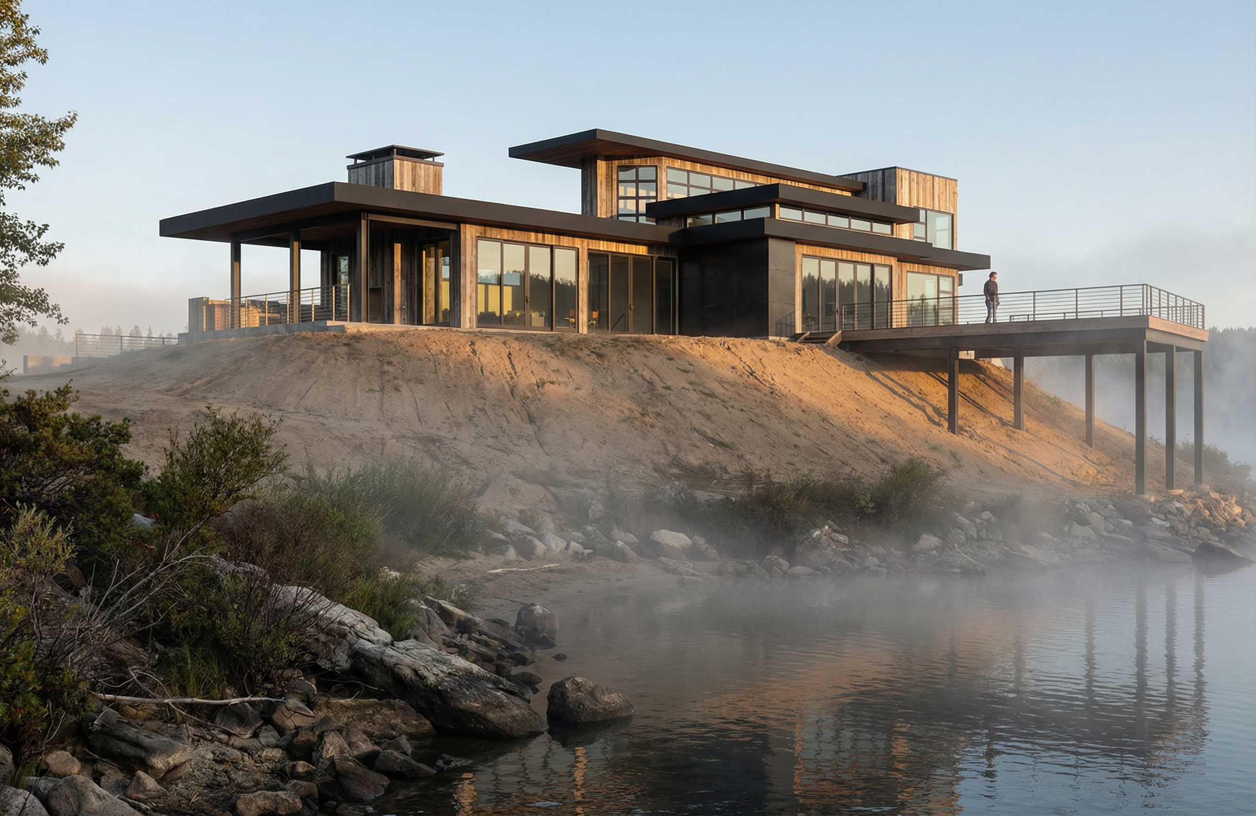 industrial home design vertical wood siding wood ceiling matte black fascia matte black steel panel accent walls lake shoreline foreground fog