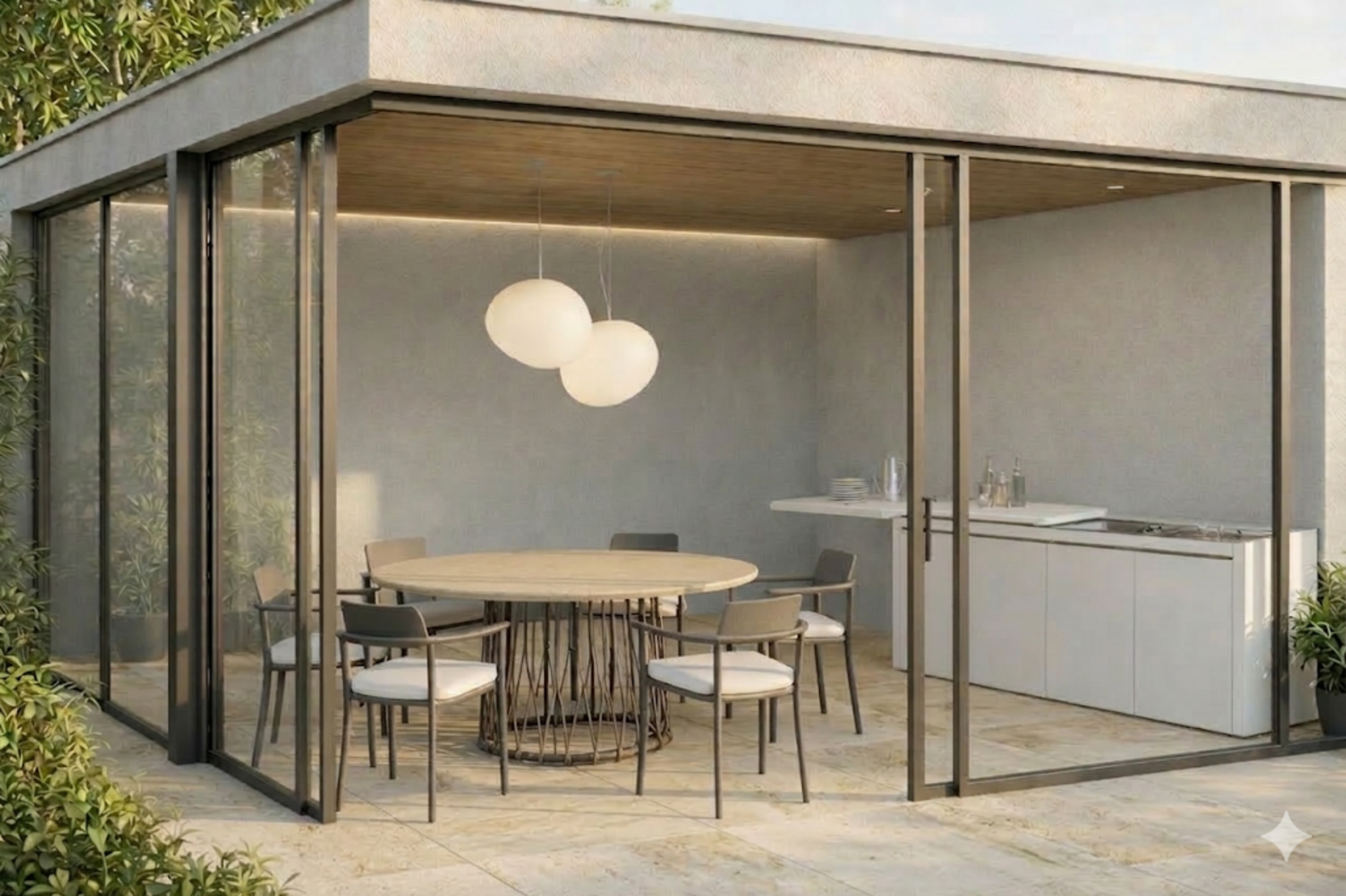 keep the entire image exactly as it is no changes to furniture kitchen walls floor ceiling windows lamps or any other objects improve only the realism light shadows materials and perspective should appear more natural and realistic without altering the arrangement proportions or colors of the existing elements