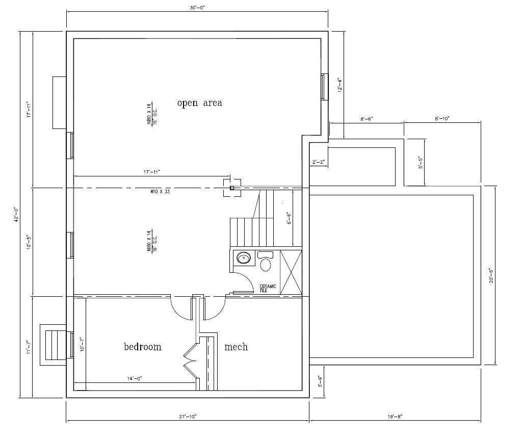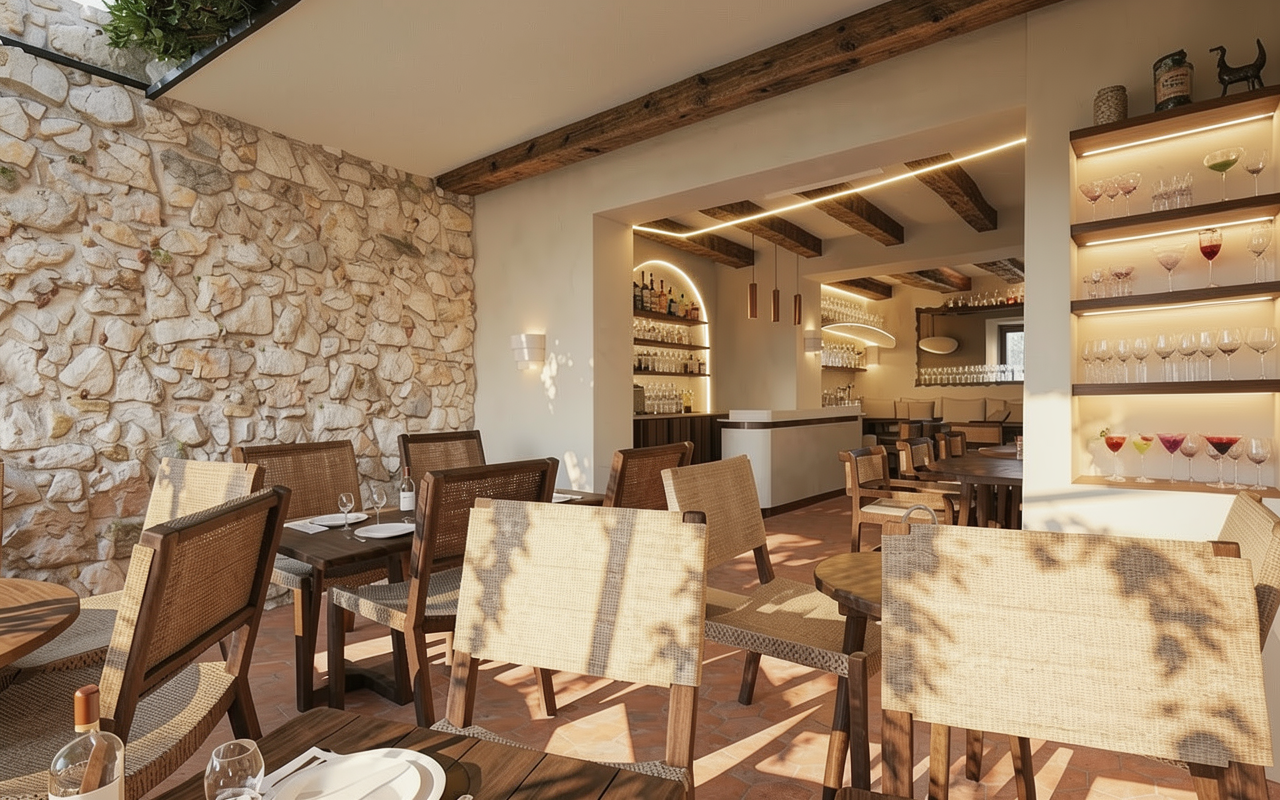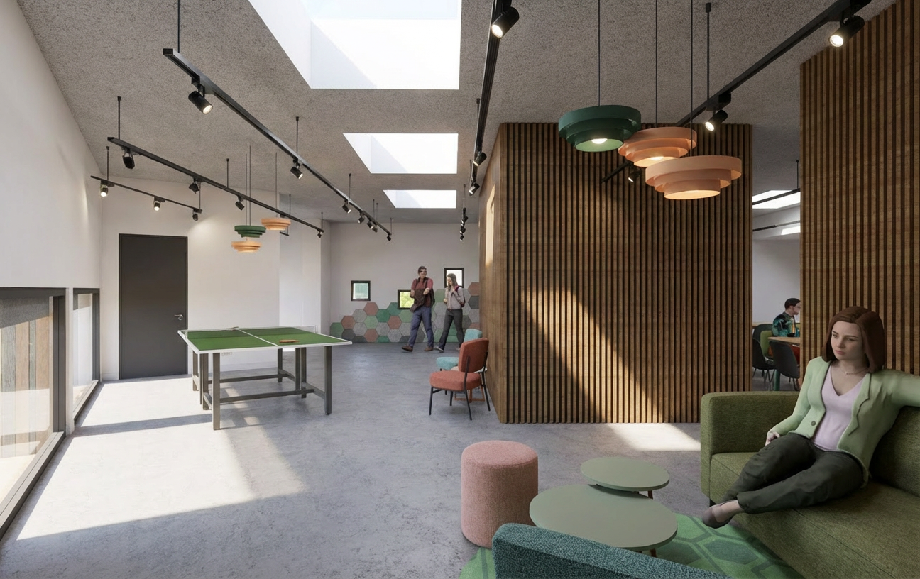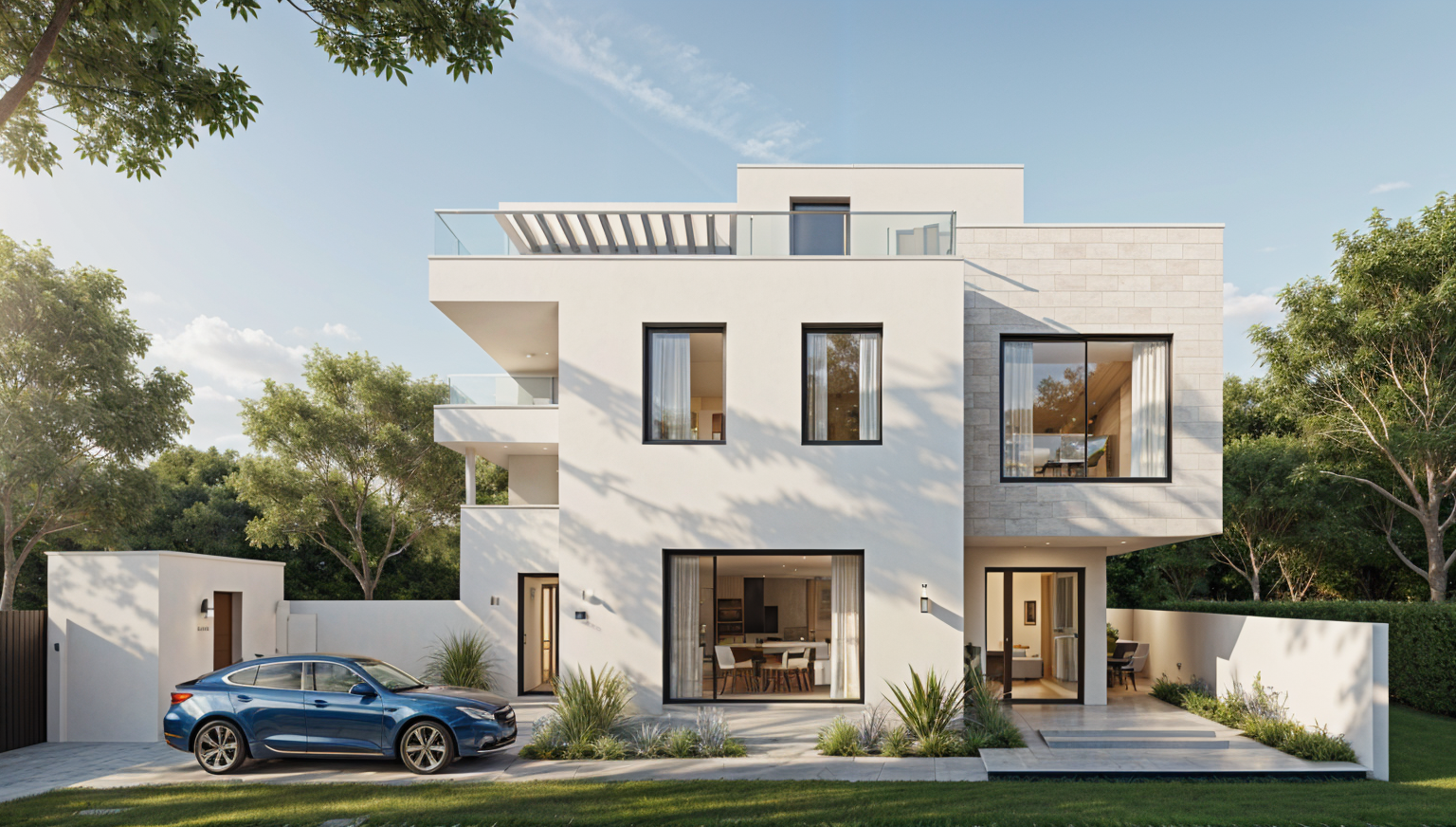 render a modern architectural floor plan highlighting an expansive open living area use soothing neutral tones like soft beige for walls and light gray accents with deep navy blue for doors and trims the bedroom should exude warmth with earthy tones like gentle taupe and soft olive green create a sleek contemporary bathroom with glossy white ceramic tile and brushed steel fixtures the entire space should feel airy and inviting filled with natural light and a touch of greenery creating a calm and harmonious atmosphere