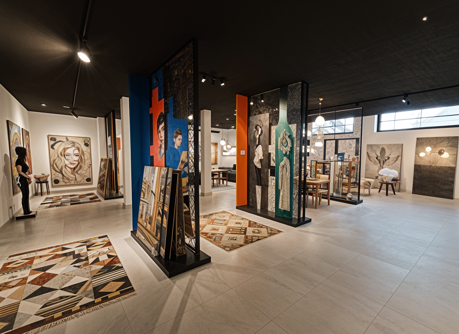 le corbusier wide angle shot artistique wide angle shot furniture and home accessories showroom colorful and artist design many small partitions each partition for only 1 supplier rugs partition artwork partition lighting partition furniture partition wall textures home accessories partition fabrics curtaines add artistique partitions to separate every supplier black ceiling grey floor no windows architecture
