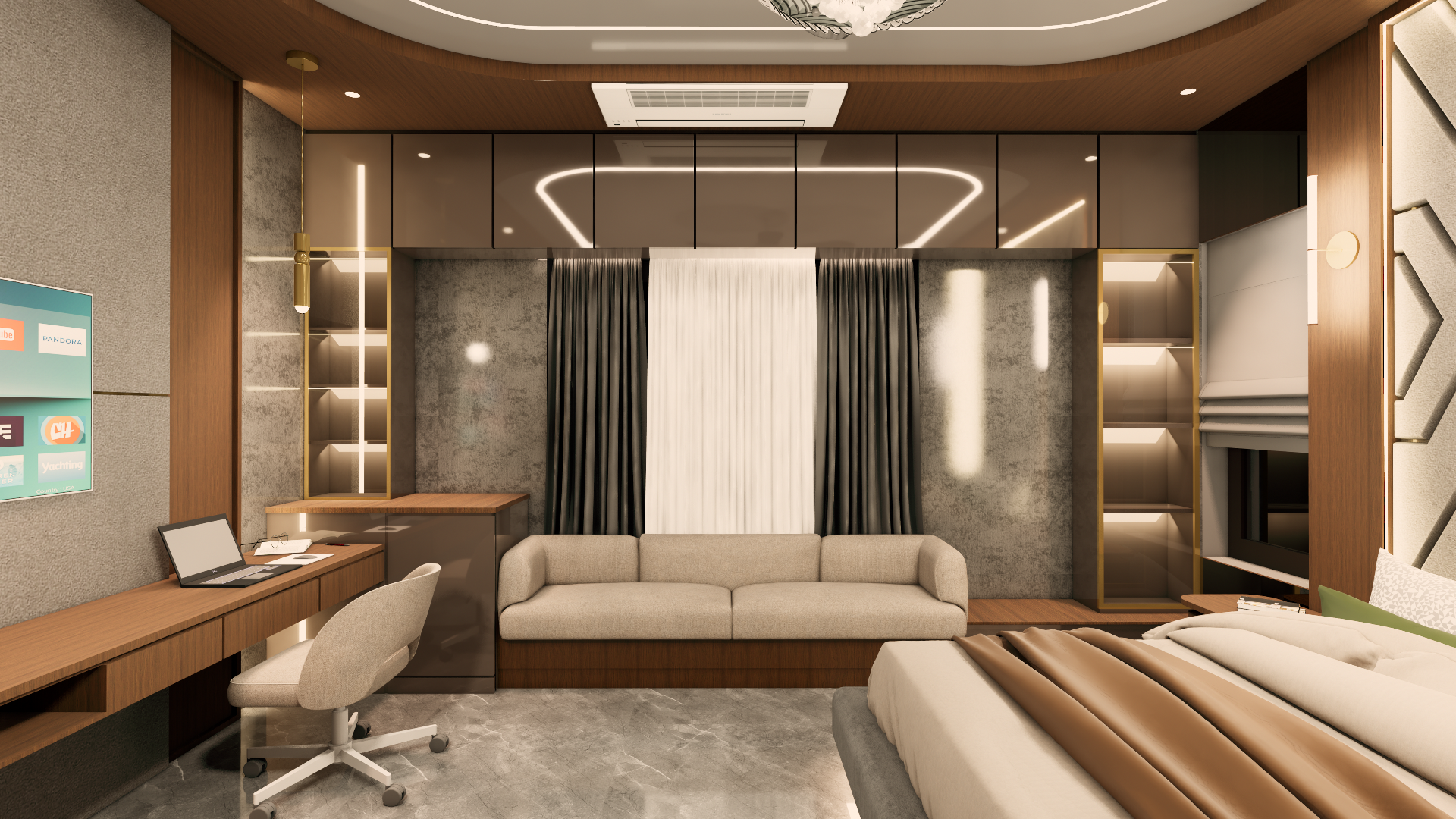 make changes in colors if required to the room with the color pallete walnut wood medium and dark grey beige and brass metal and let the room look dark but cozy and make it look realistic
