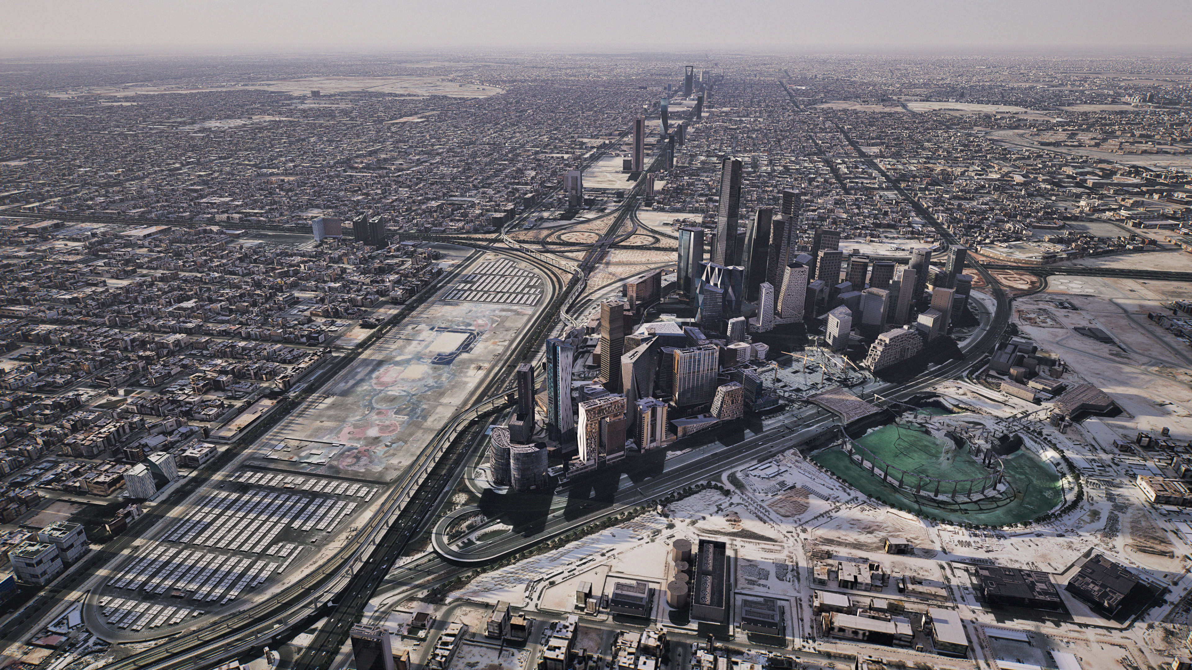 photorealistic enhancement of a high fidelity architectural render of riyadh financial district preserve the original building geometry skyline proportions layout and all iconic structures exactly as rendered enhance material realism only improve surface texture clarity on facades especially small residential houses near the main road add realistic concrete plaster stone and asphalt micro detail enhance window glass depth subtle reflections and interior light variation strengthen ambient occlusion in architectural joints and edges improve lighting realism without changing sun direction physically accurate global illumination natural shadow softness and contact shadows very subtle atmospheric depth consistent with riyadh desert conditions no redesign no added buildings no removed elements no stylistic changes final result should resemble a real architectural photograph not concept art