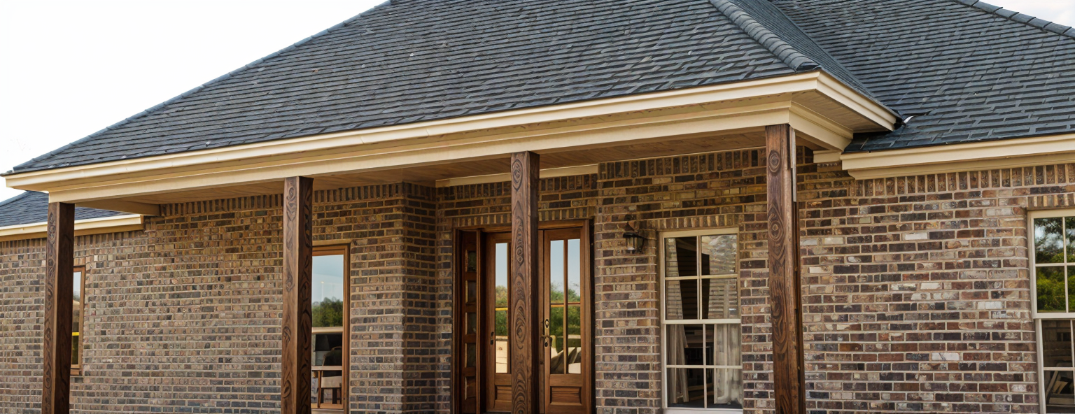 white siding oak beams black metal roof stone base with lush landscaping