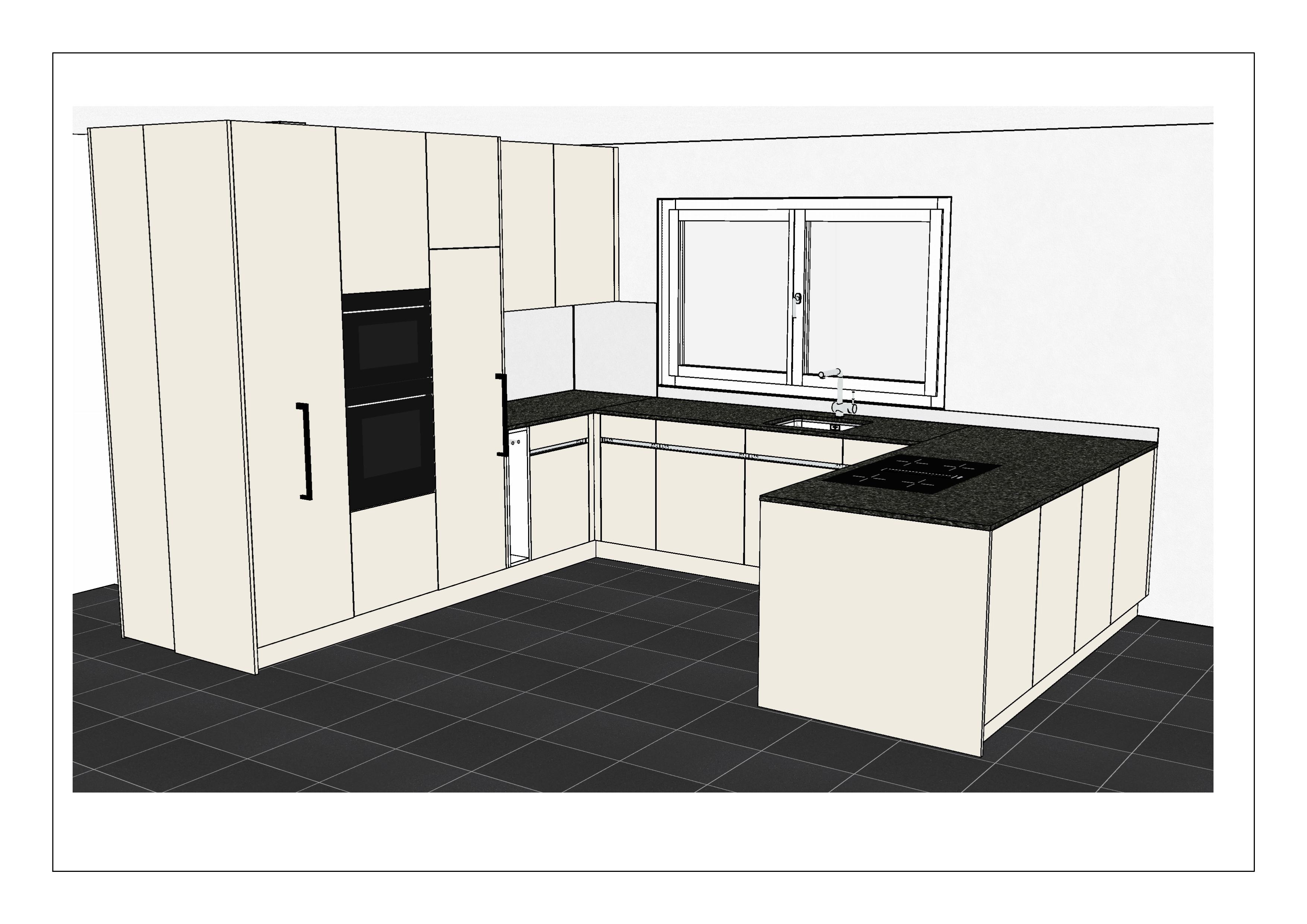 stove is induction kitchen fronts are without handles glass at the wall only where you truly see it left from the window to the height of the cabinets underneath and right of the window only this thin line behind the kitchen on the left side you can see the floor continues in the corner of the bottom cabinets you can see an open cabinet with rods in it for hanging up and drying towels floor is 45x45cm anthrazit stone