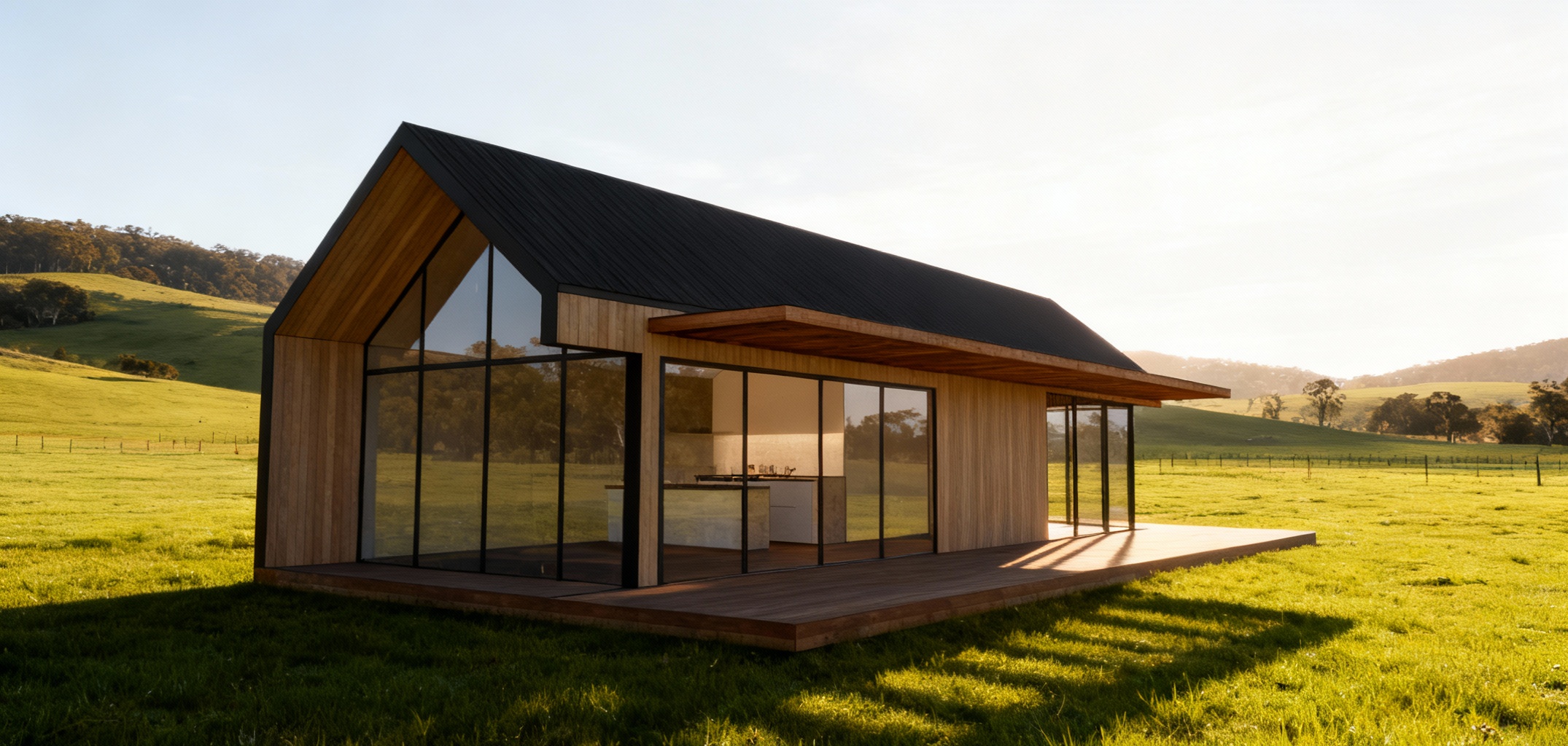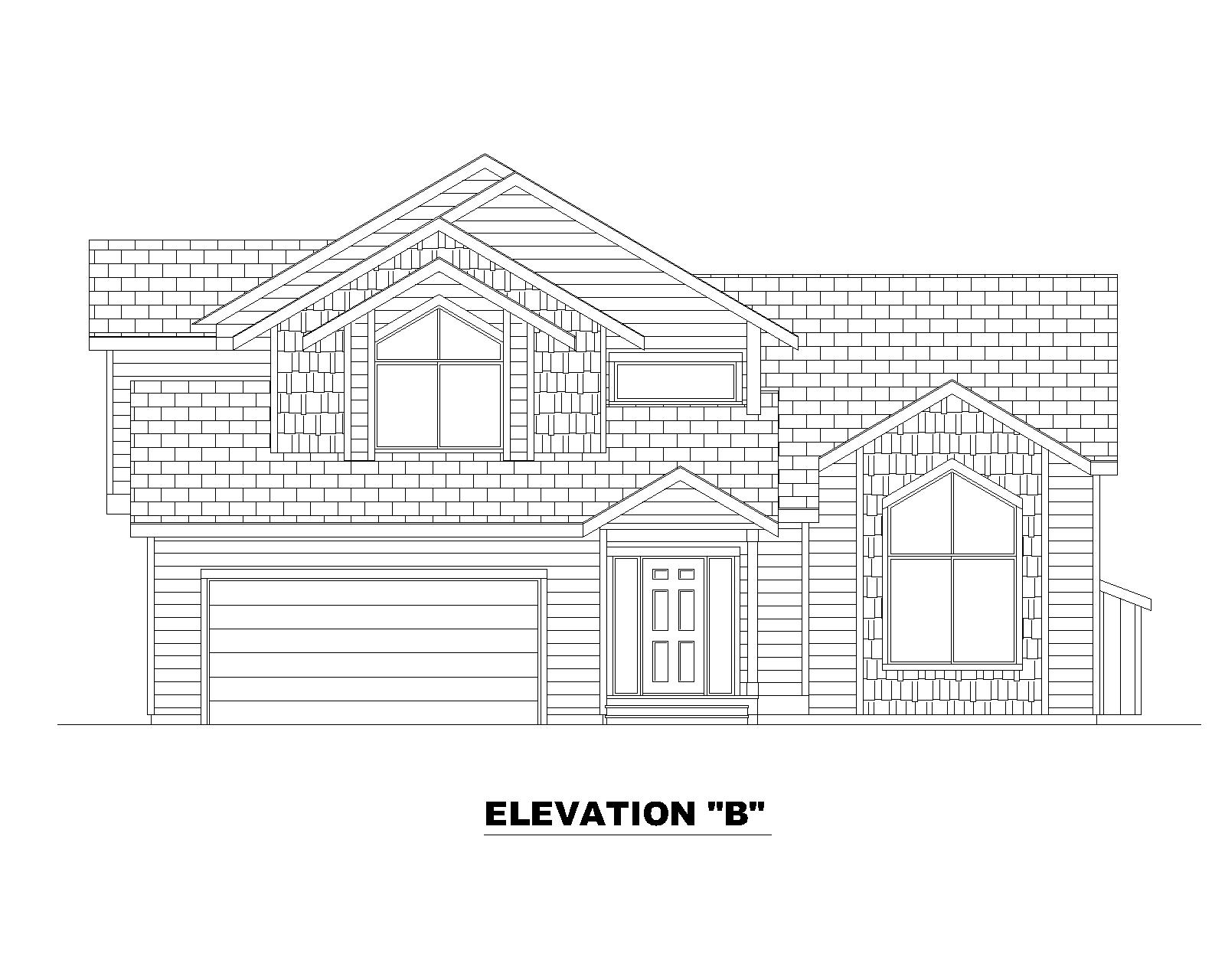 watercolor render of modern craftsman style home with dark grey color black trim and wood accents include trees and an alaska like environment in the background simple driveway and walkways in front of the home